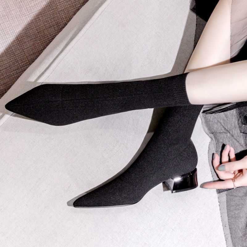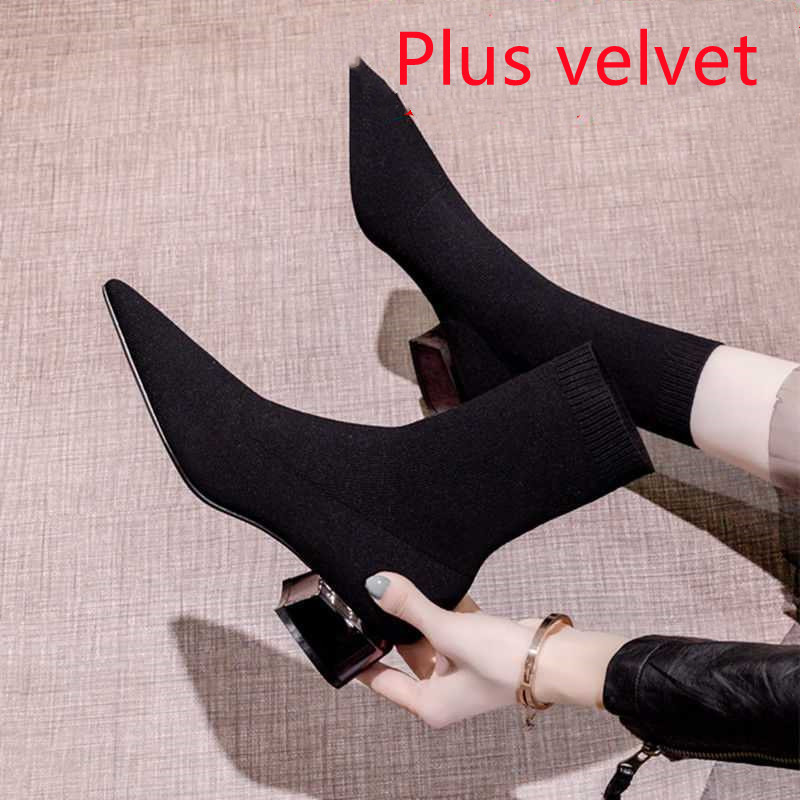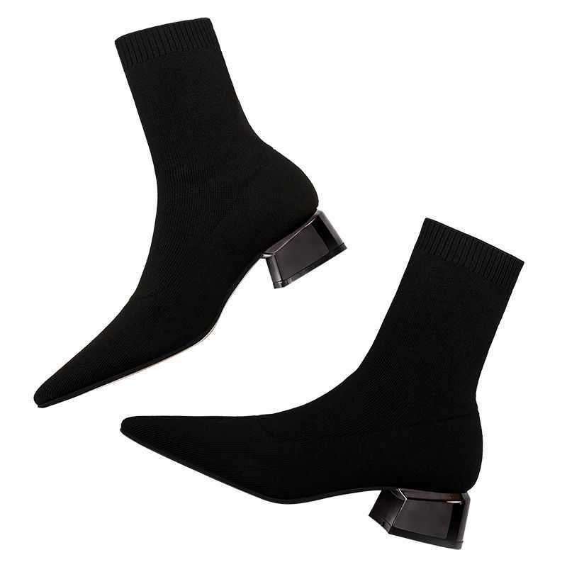 A pair of thick heel sock boots