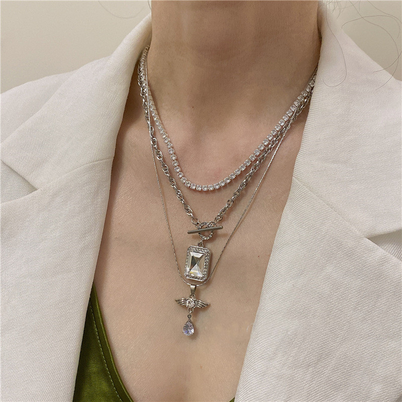 Color: 2 pieces of angel + rectangular diamonds, titanium steel necklace set, one silver medium zircon necklace