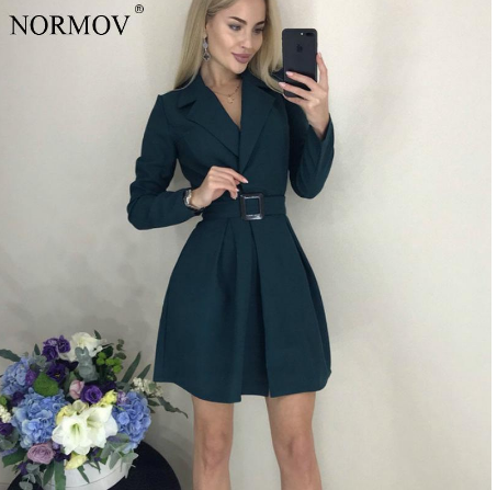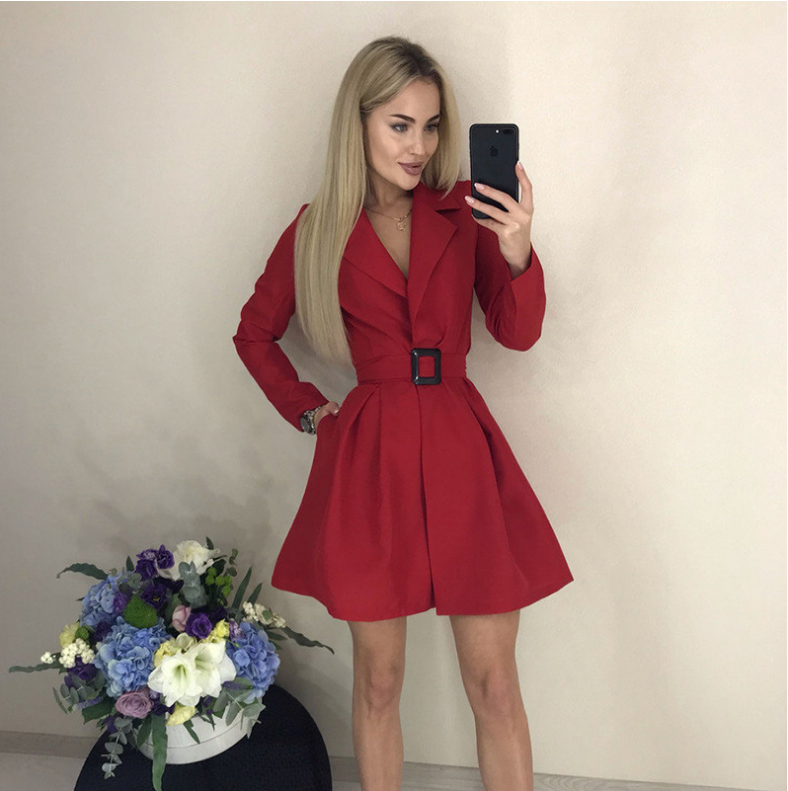 Short dress with solid color belt lapel