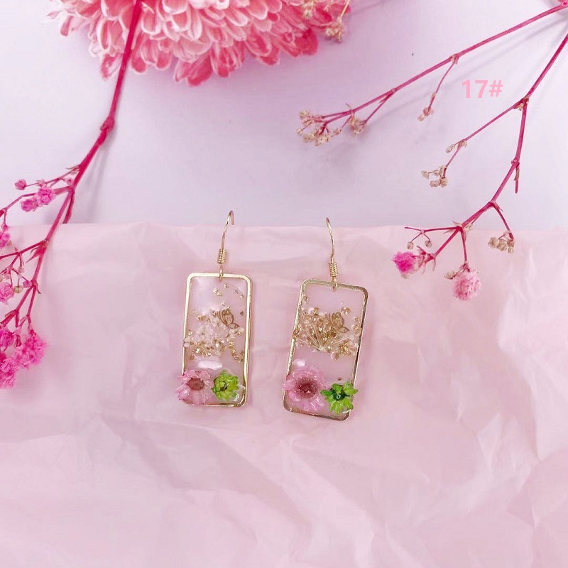 2#Rhombic gold foil pink dried flower pearl ear hook transparent,