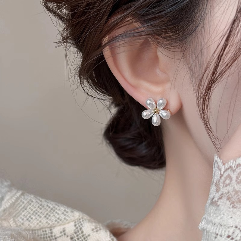 Product information:Treatment Process: Electroplating Color: Pearl Flower Earrings Applicable population: Female Material: Copper Shape: Geometry Popular elements: round Style: Korean style