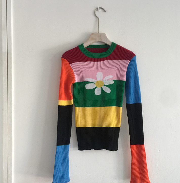 Color color matching flower sweater round neck thread knit bell sleeve
