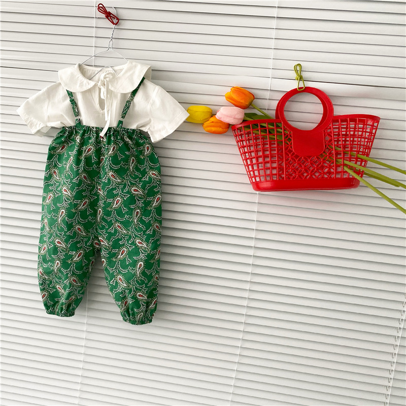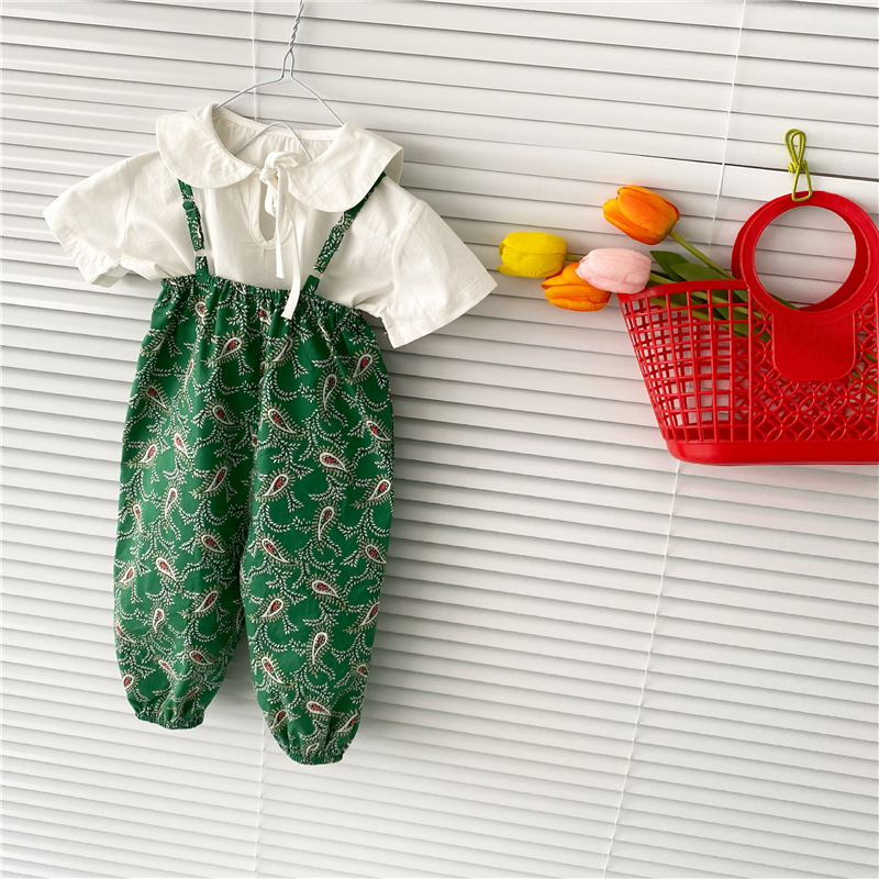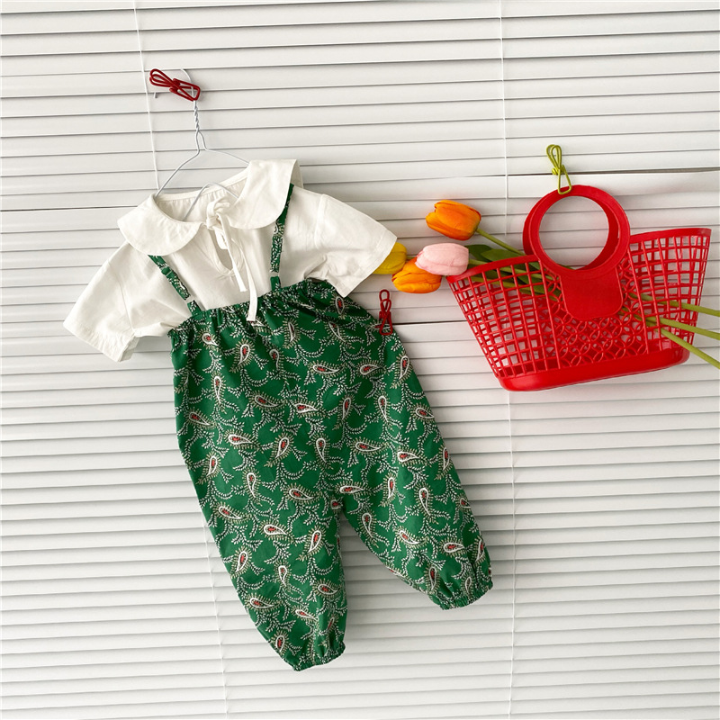 College Style Lace-up Short-sleeved Shirt Floral Suspenders Two-piece Suit