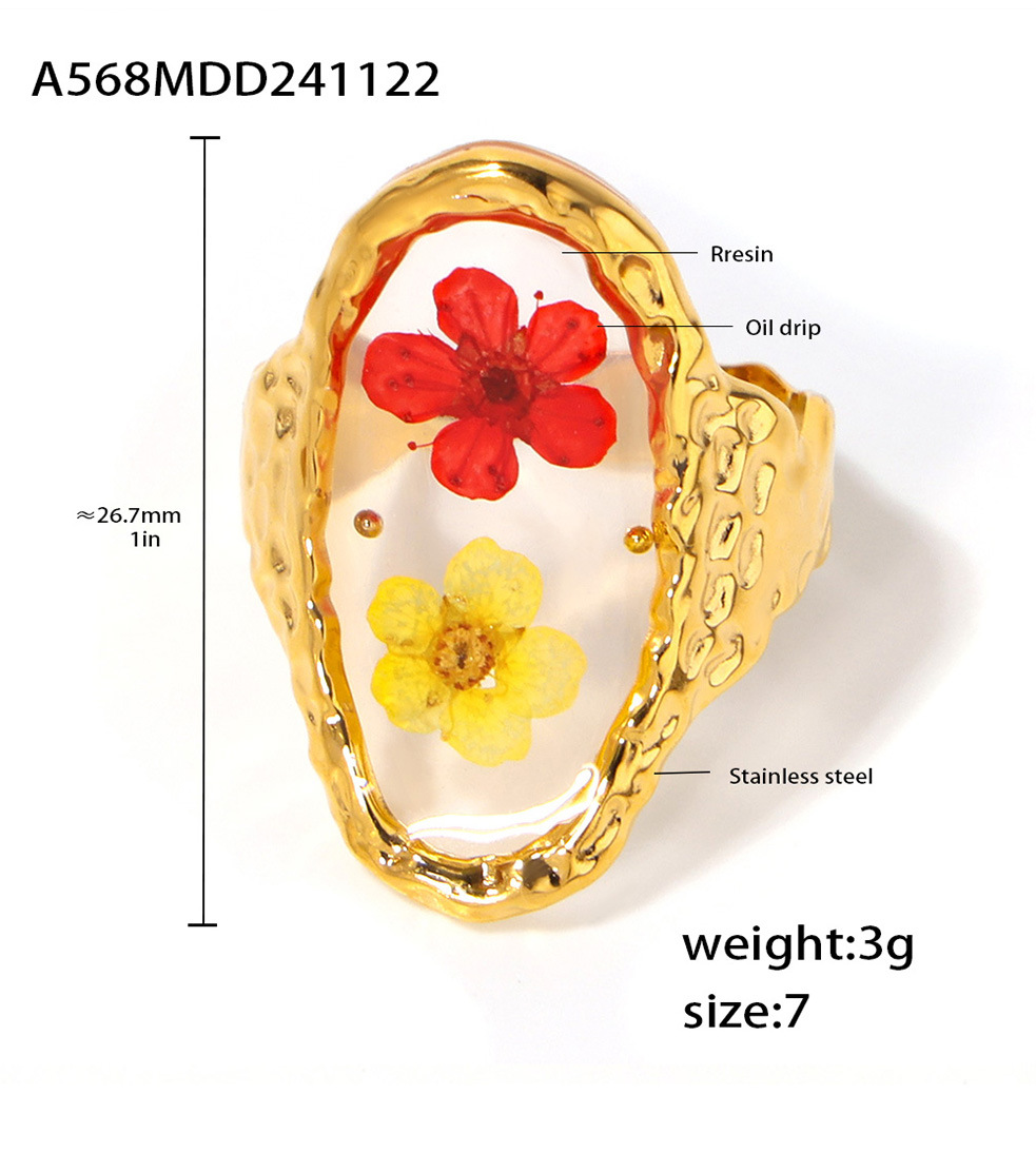 Product information:Type: Ring Treatment Process: Electroplating Color: A568-gold resin dried flower ring, A568-steel resin dried flower ring Applicable population: Female Size: no.7 Material: stainless steel/resin