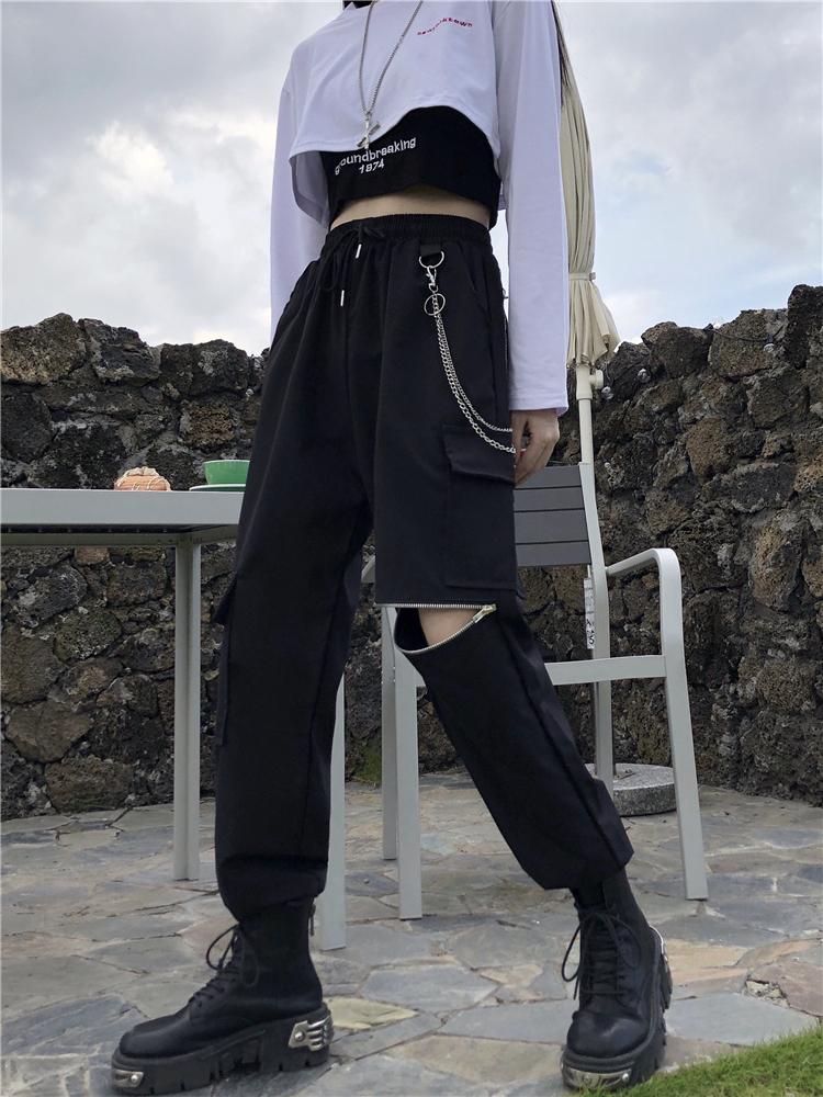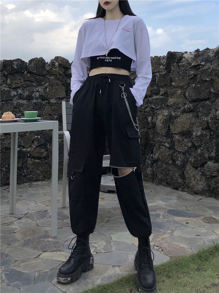 Color: black pants, white T-shirt and vest