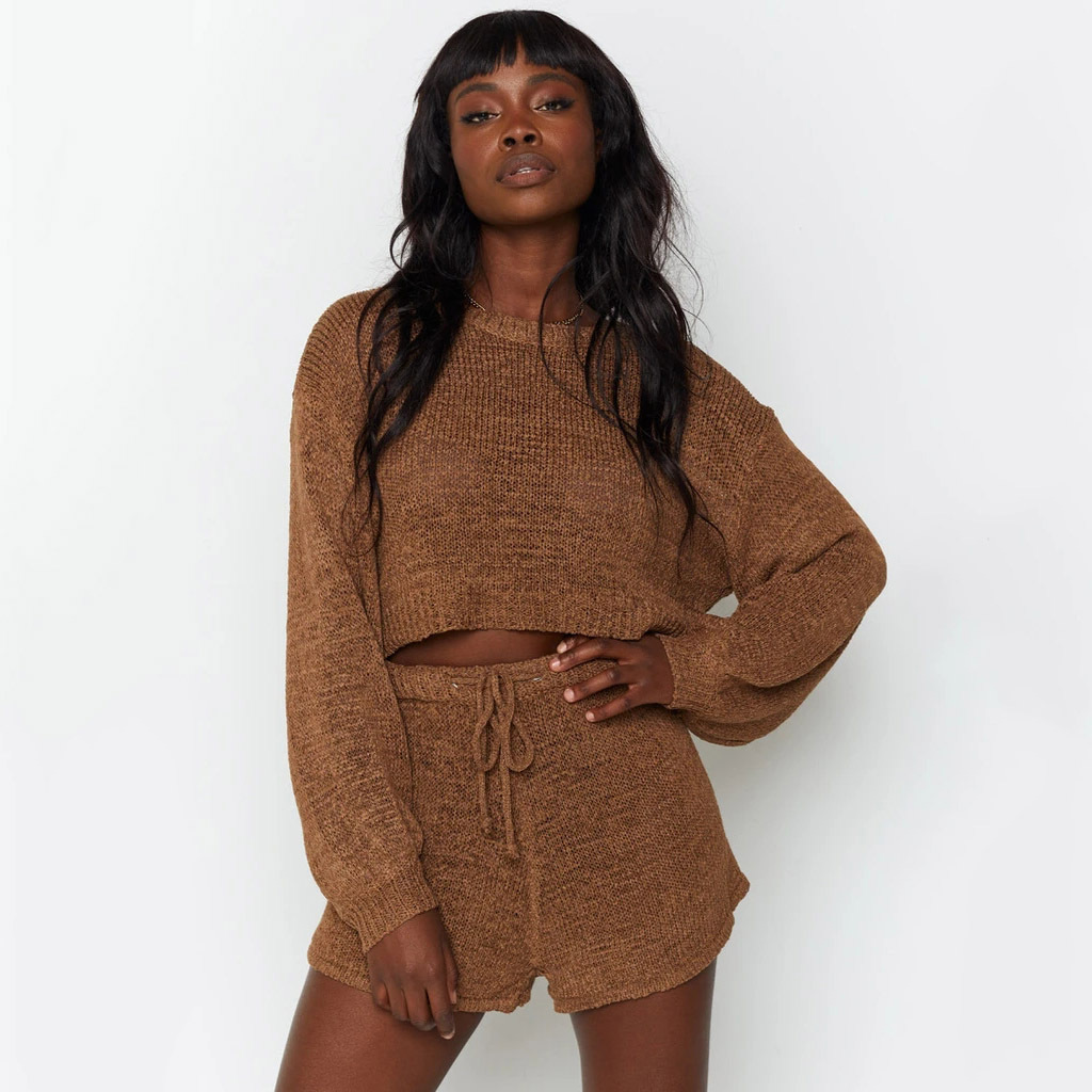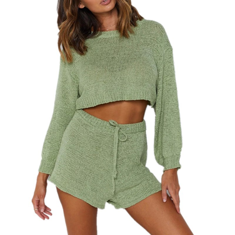 Independent station hot autumn and winter sweater long sleeve suit Amazon cross-border new home solid color shorts two-piece suit |