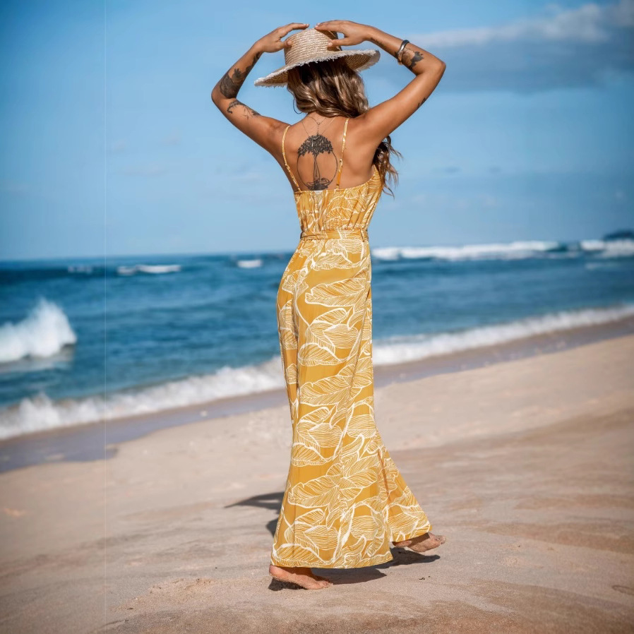 Product information: Color: Ginger yellow Waist Type: Mid waist Size: XS,S,M,L,XL Sleeve type: sleeveless Main fabric composition: Polyester (polyester fiber) Pants type: Big Horn type Craft: embossing