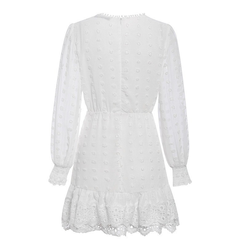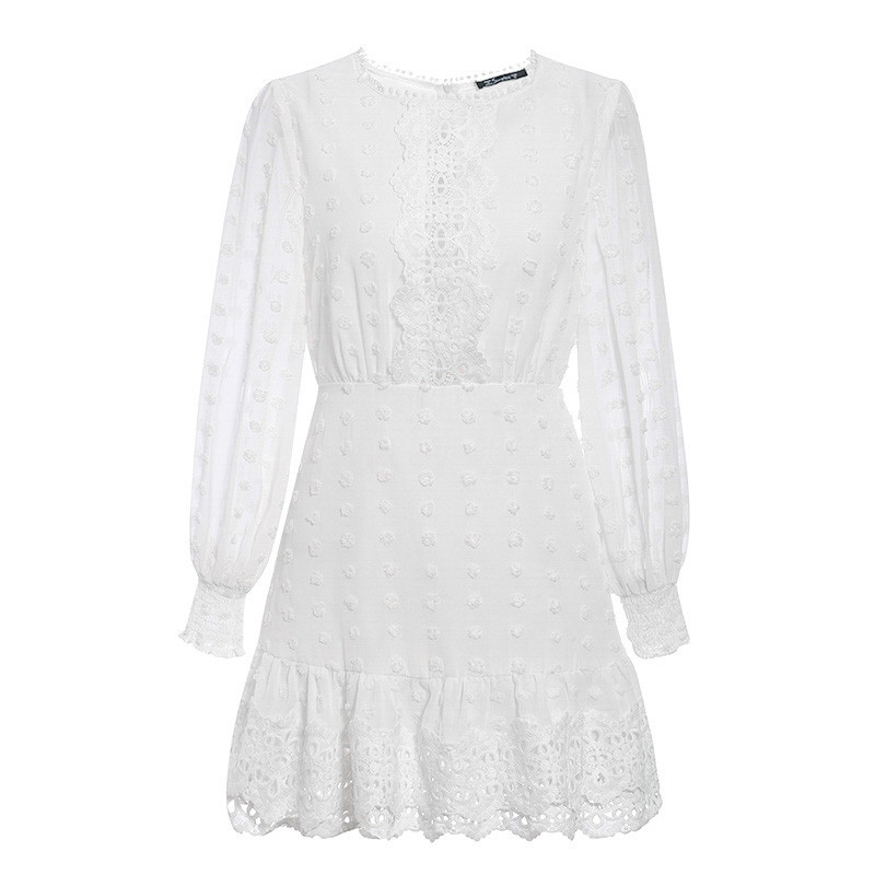Material: PolyesterSize: S M LStyle: sweetCollar type: round neckWaist type: high waistClothing placket: zipperColor Category: WhiteSleeve type: bubble sleeveSleeve length: long sleevedress length: middle dress