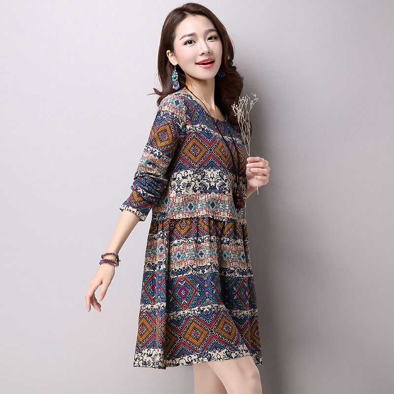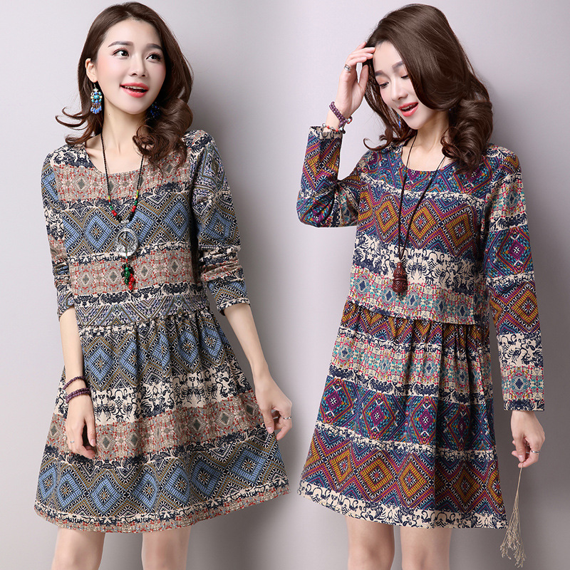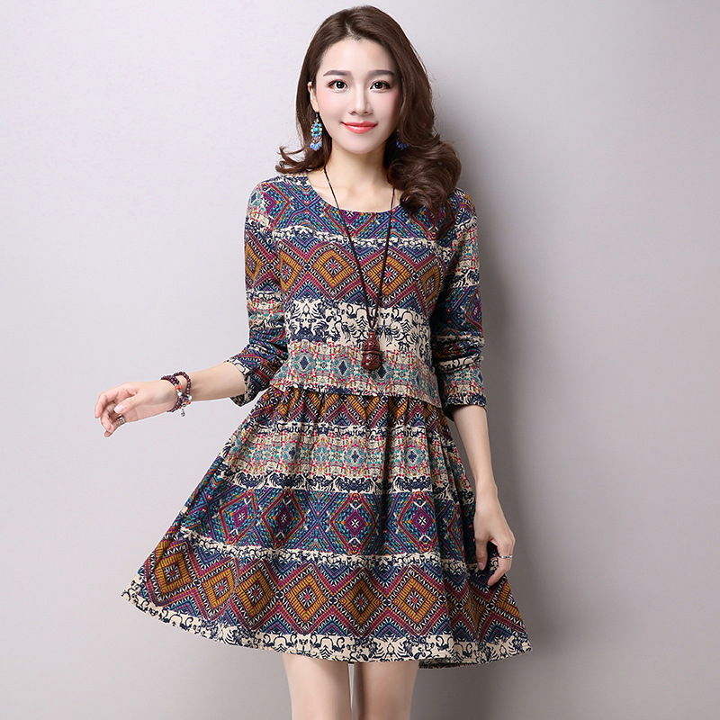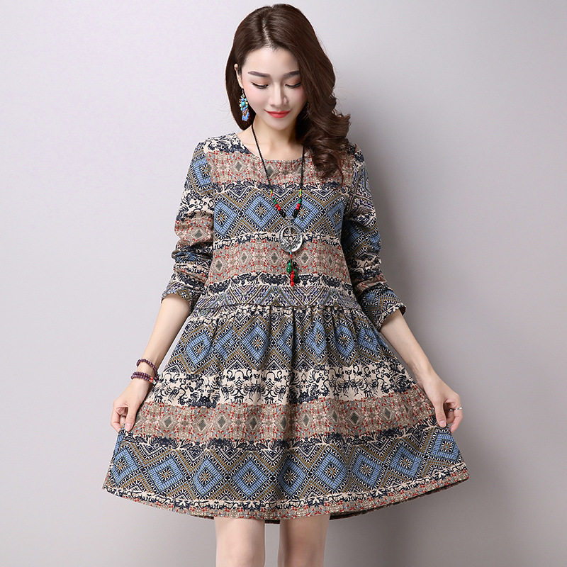 Ethnic style cotton and linen large size women's head geometric print long sleeve skirt dress