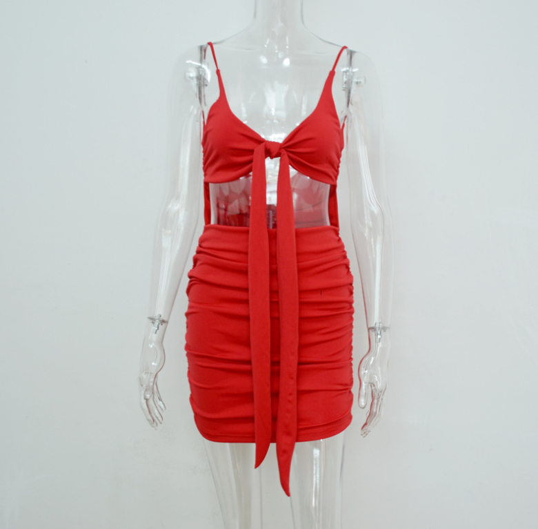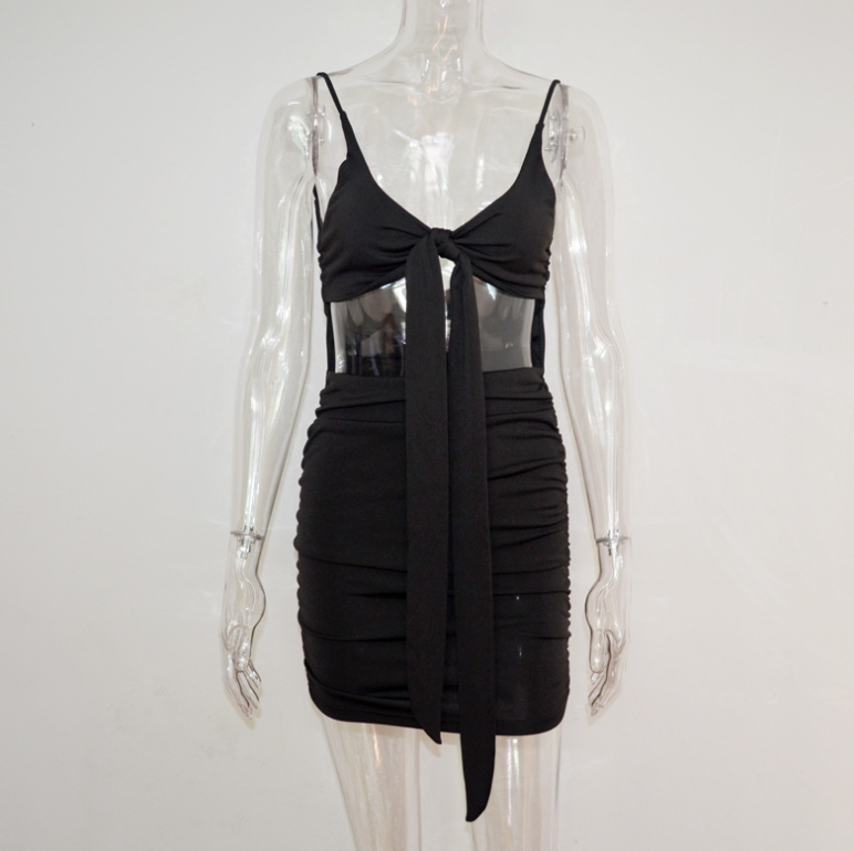 European and American solid color deep V strap backless pleated dress