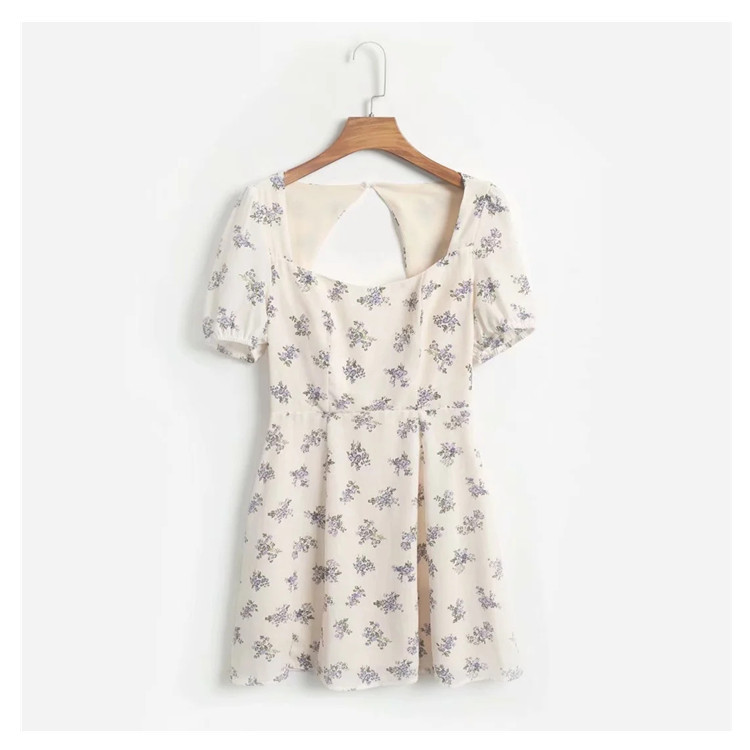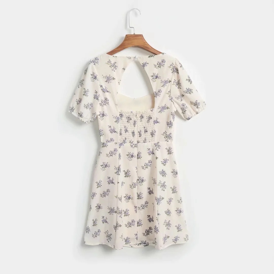Floral Square Neck Puff Sleeve Back Hollow Short Dress