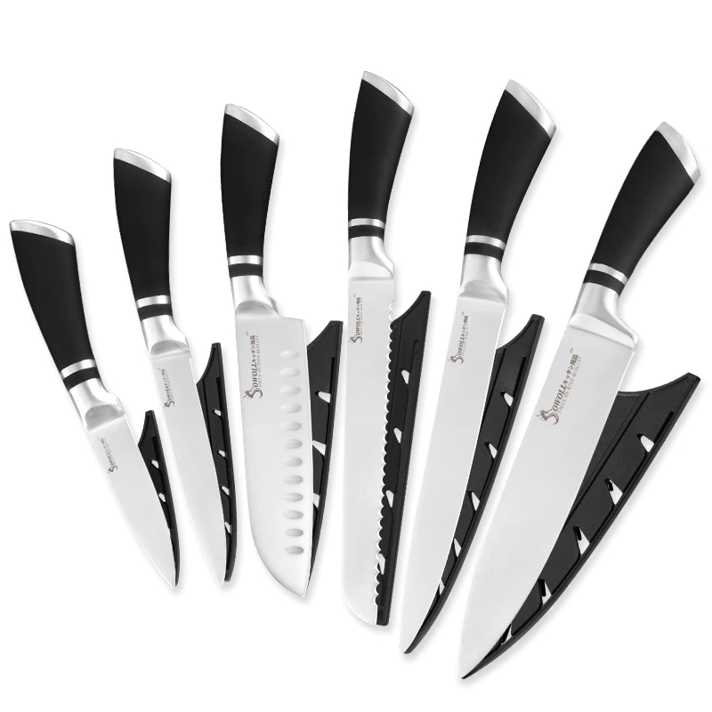 Black horseshoe handle with steel ring 6 piece set of knives8 inch chef knife8 inch meat cleaver8 inch bread knife7 inch Japanese knife5 inch knife3.5 inch fruit knife