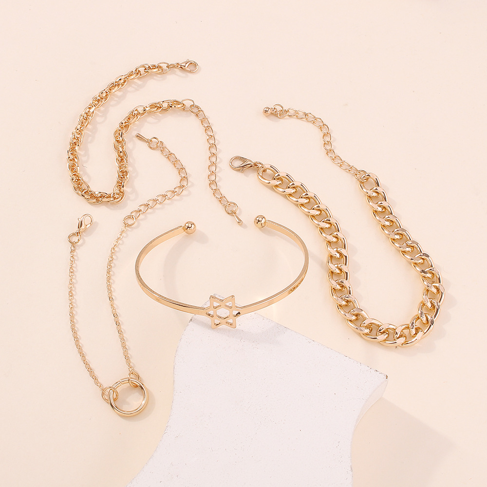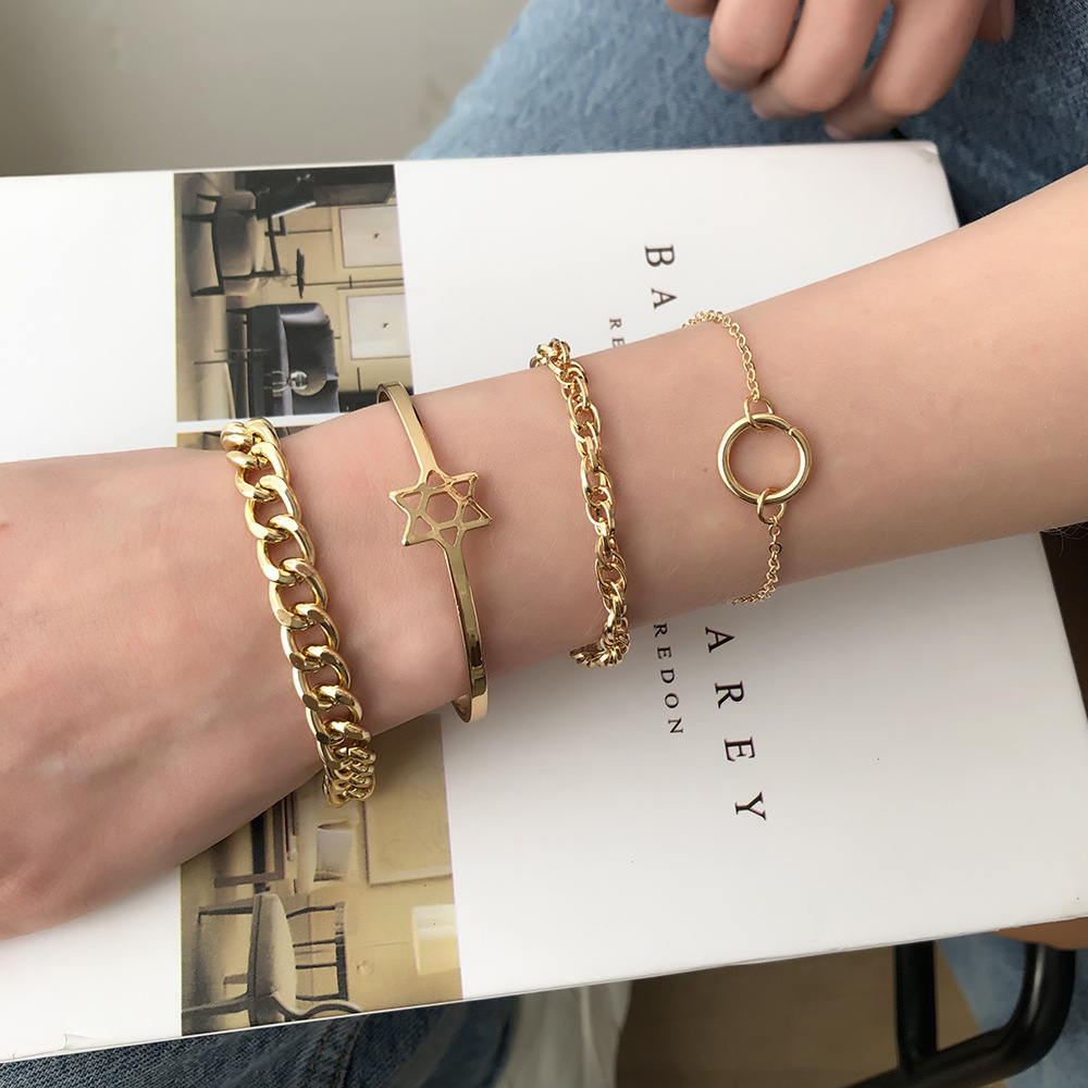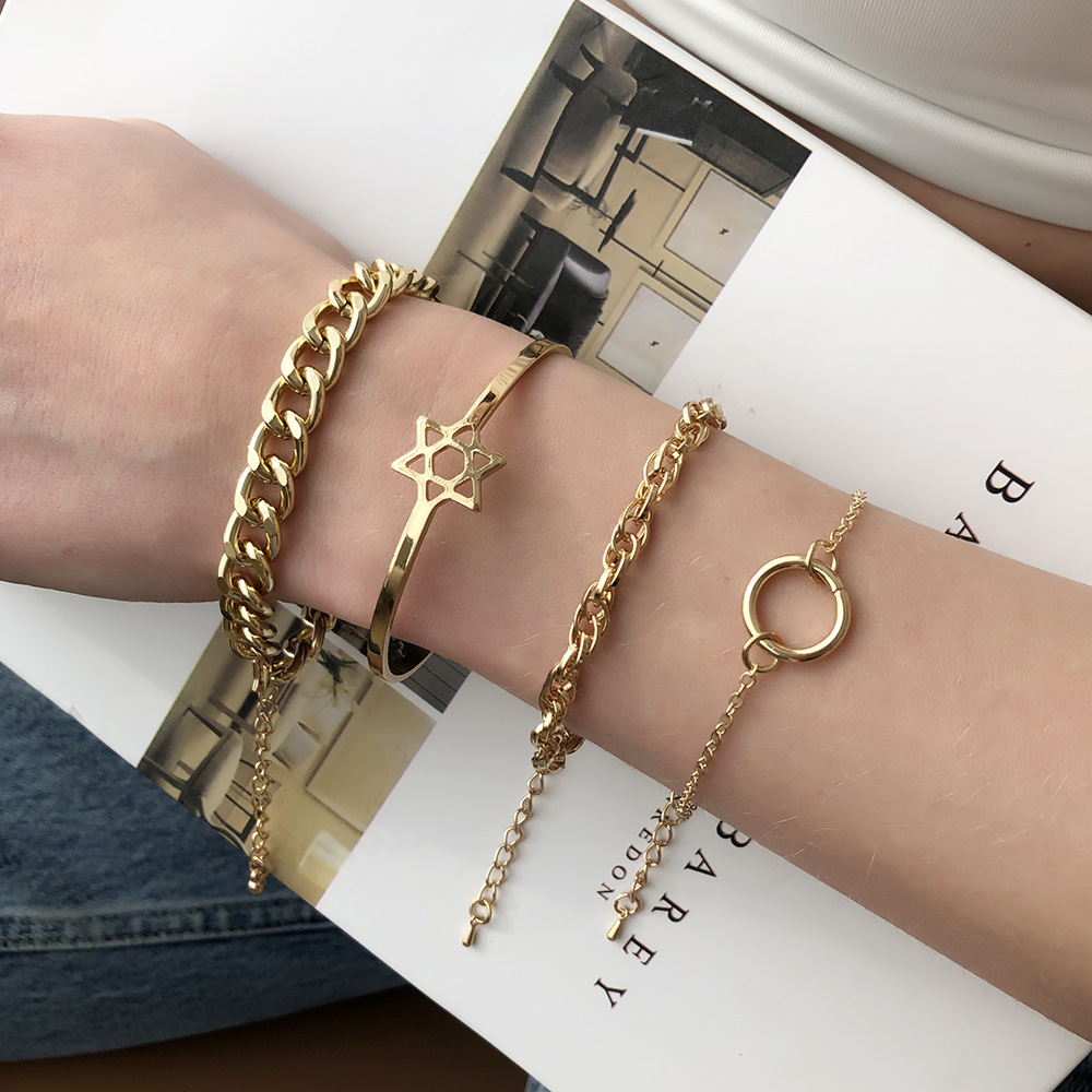 Product information:Style: Europe and AmericaMaterial: Electroplating alloyType: BraceletStyle: Women'sModeling: GeometryInlaid material: not inlaidColor: goldenPackaging Information:Alloy bracelet x1