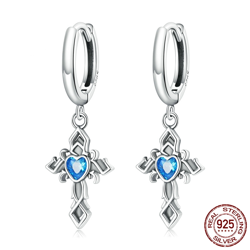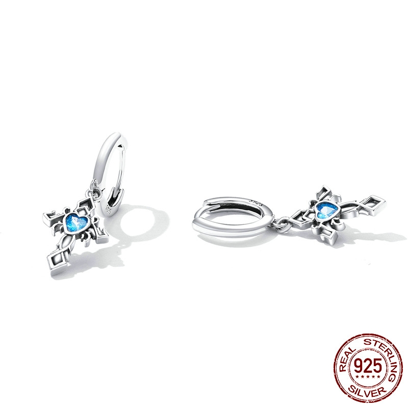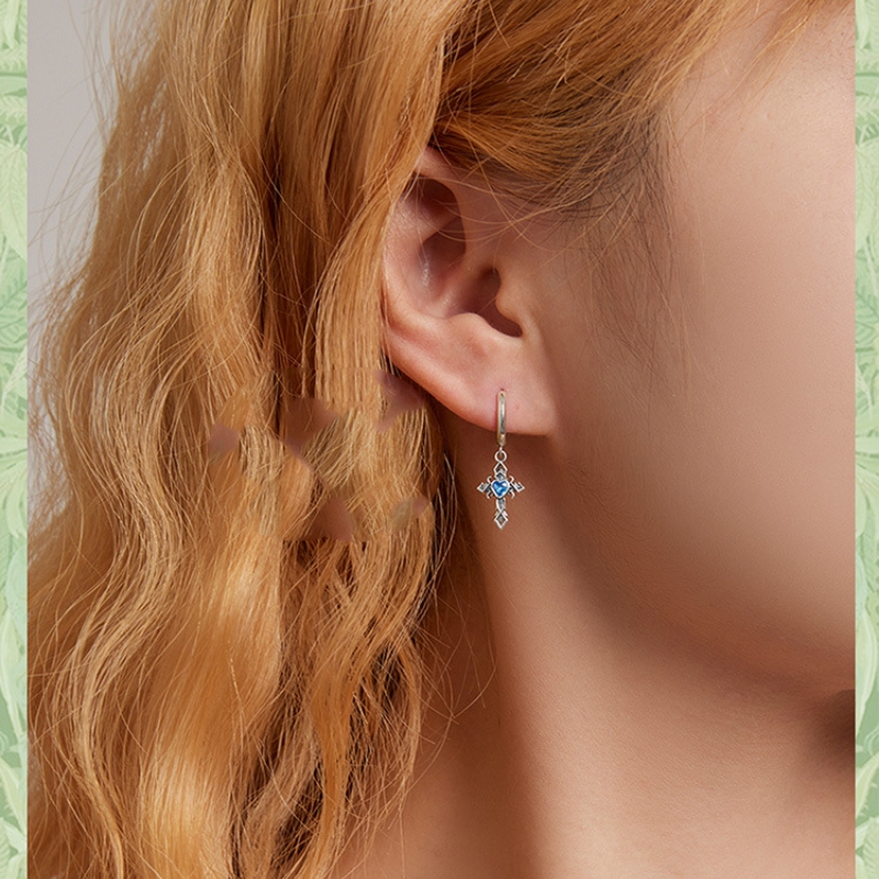 Sterling Silver S925 Vintage Cross Ear Clip Blue Heart-shaped Zircon