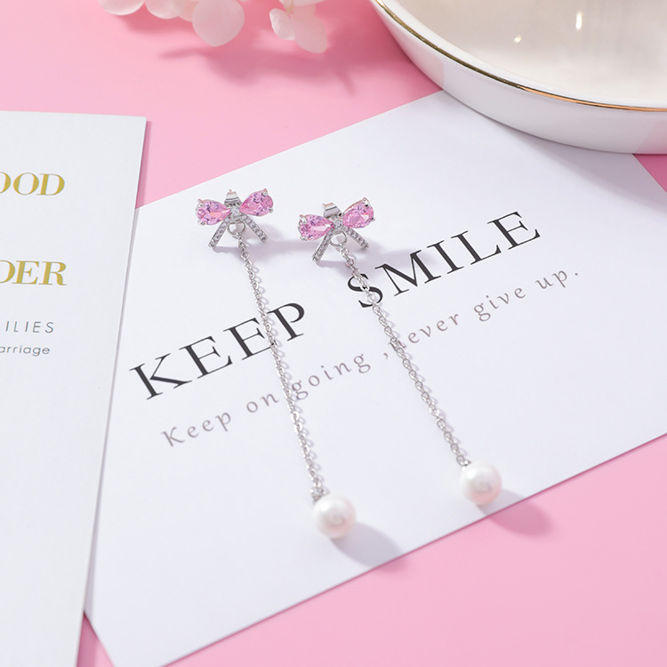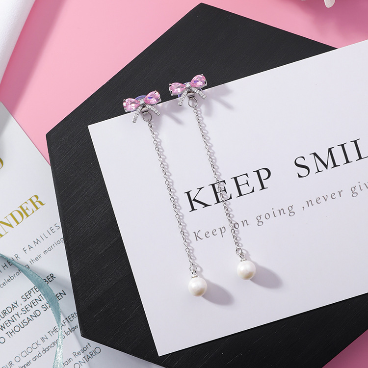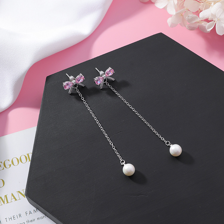 925 Silver Needle Micro Zircon Bow Earrings Beads Small Pearl Temperament Long Fringe Earrings