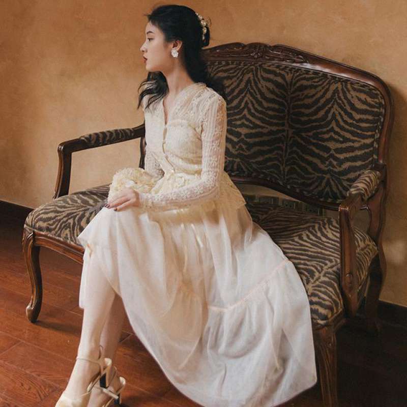 Women's Vintage Lace Court Shirt Mesh Skirt Two Piece Set