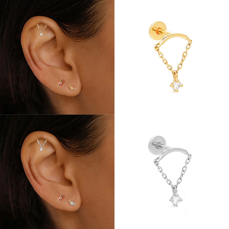Color: [yellow gold] chain single rhinestone ear studs (single), [White Gold color] chain single rhinestone ear studs (single)
