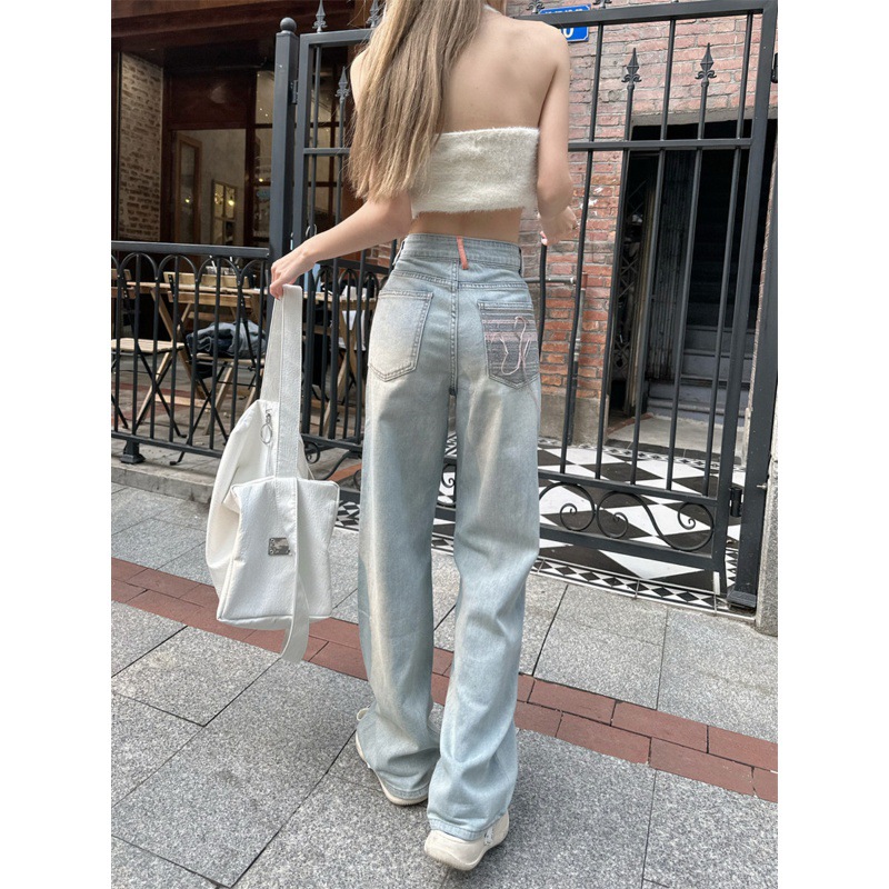 Summer Washed High Waist Loose Slim Wide Leg Jeans Women's Design Light Blue Narrow Straight Floor-length Pants