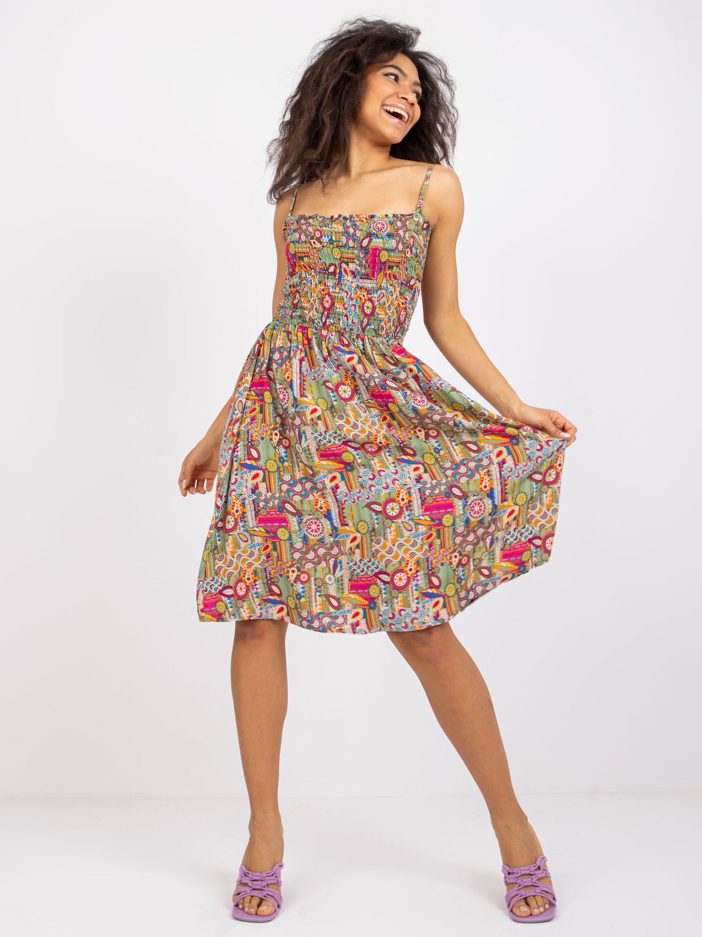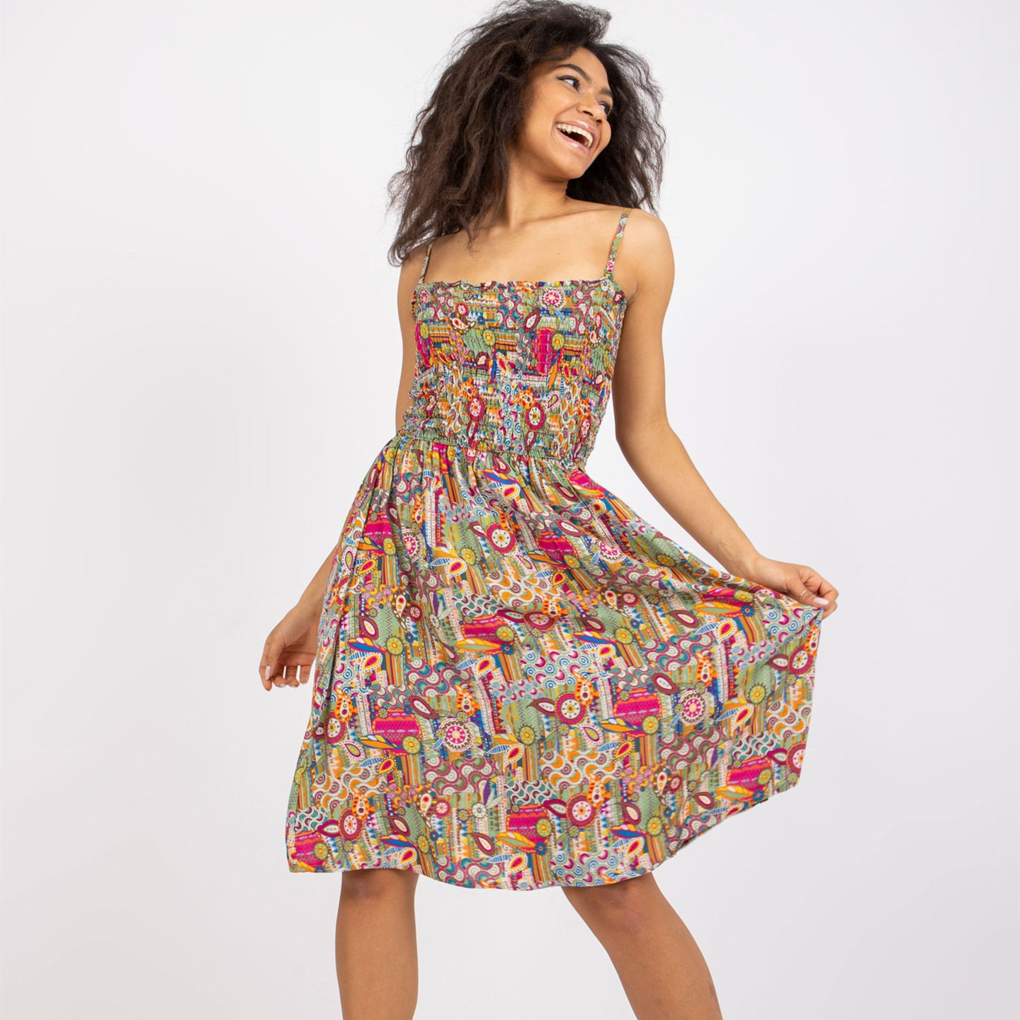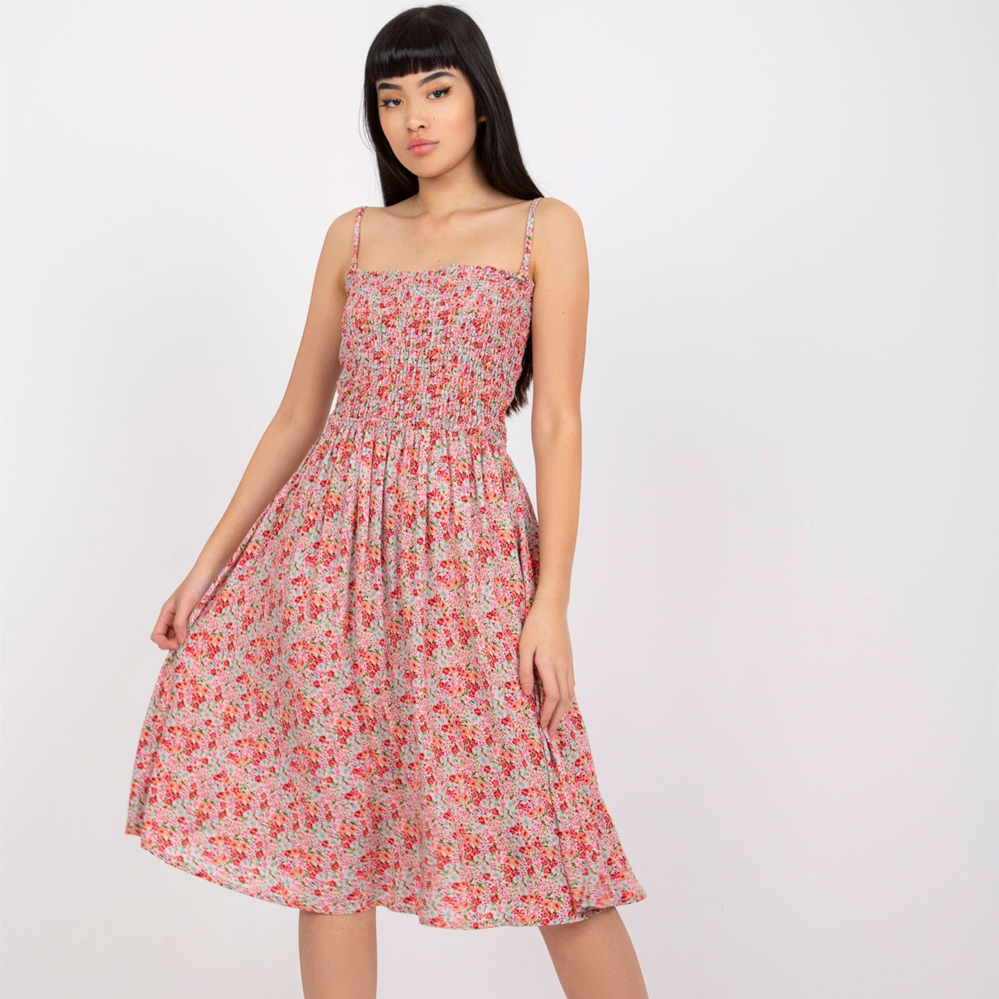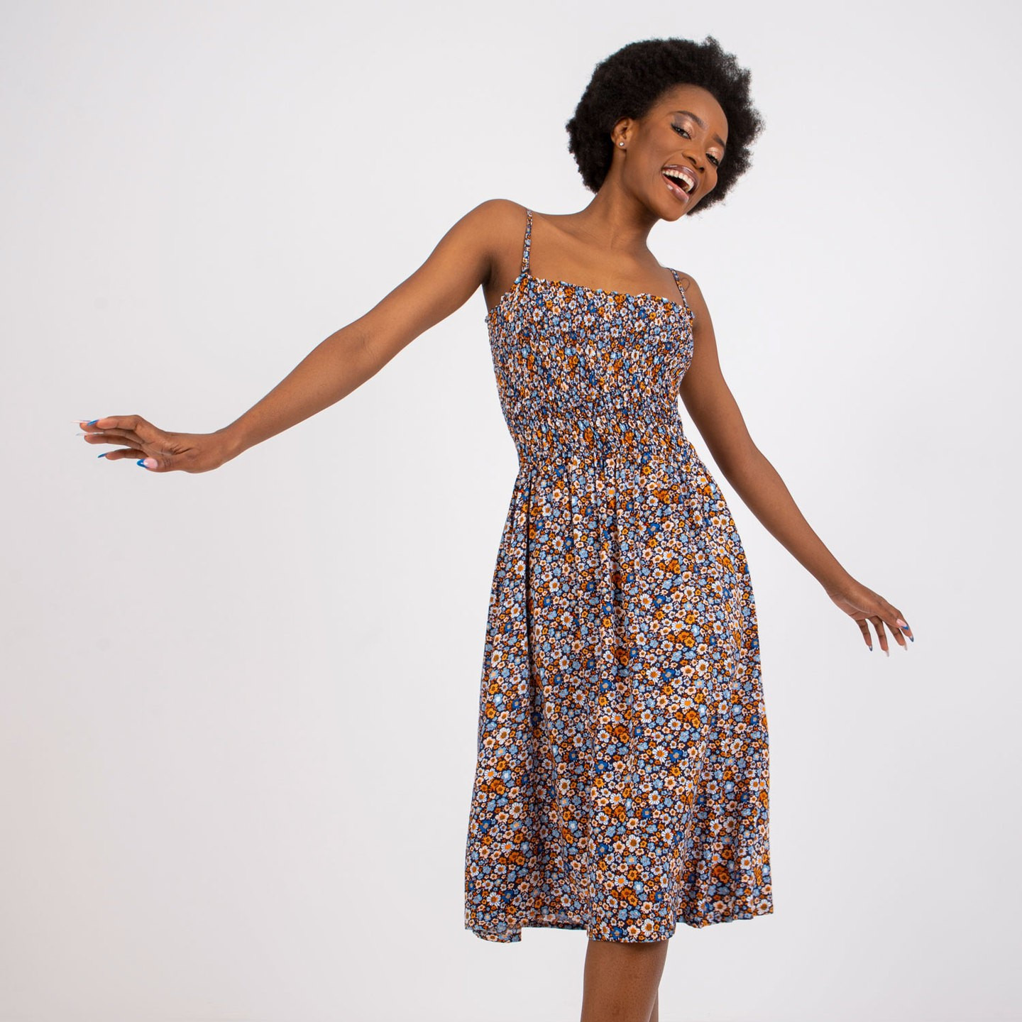 Color: Floral blue, orange, peach, red and yellow flowers