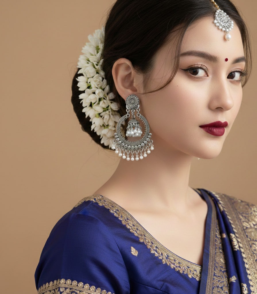 Add a touch of royal luxury to your look with our meticulously crafted earrings. These earrings feature a classic Jhumka drop design set inside a decorative circular hoop, adorned with intricate hand-engraved patterns, giving them a unique heritage style that never goes out of fashion.
