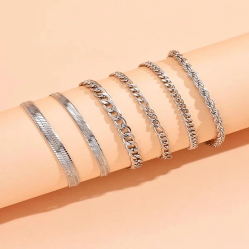 Upgrade your accessory collection with this elegant 6-piece chain bracelet set, designed to give you endless styling possibilities. Featuring a curated mix of sleek snake chains, classic link chains, and textured rope designs, this versatile set lets you stack multiple bracelets for a bold layered look or wear them individually for subtle everyday elegance. each bracelet adds a modern, refined touch that pairs effortlessly with casual outfits, office wear, or evening styles. Lightweight, comfortable, and easy to match, this set is perfect for daily wear or as a thoughtful gift.