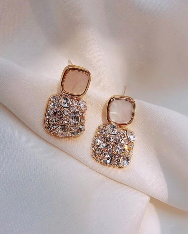 Add a luxurious touch to your look with these earrings designed in a modern geometric style that blends simplicity with sophistication. They feature a dual-structure design that creates an elegant presence on the ear, with a smooth upper section and a stone-embellished lower part that delivers a soft, eye-catching sparkle as it reflects the light. Lightweight and comfortable for all-day wear, they are a perfect choice for special occasions as well as refined everyday looks.