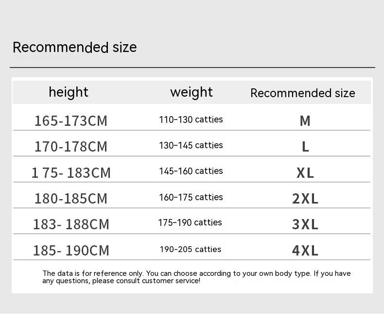 Size: M 52.50kg-62.50kg,L 62.50kg-72.50kg,XL 72.50kg-80.00kg,2XL 80.00kg-87.50kg,3XL 87.50kg-95.00kg,4XL 95.00 kg-102.50kg