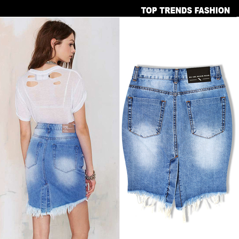 European and American women's high waist slim hole ladies denim bag hip skirt irregular sexy hem tail after split