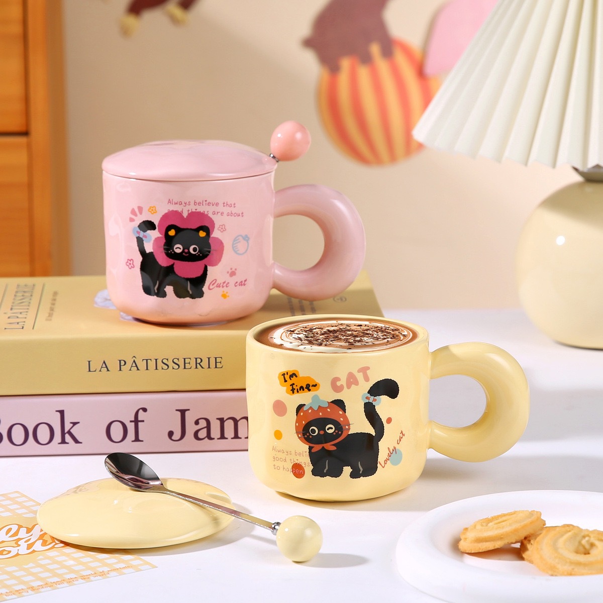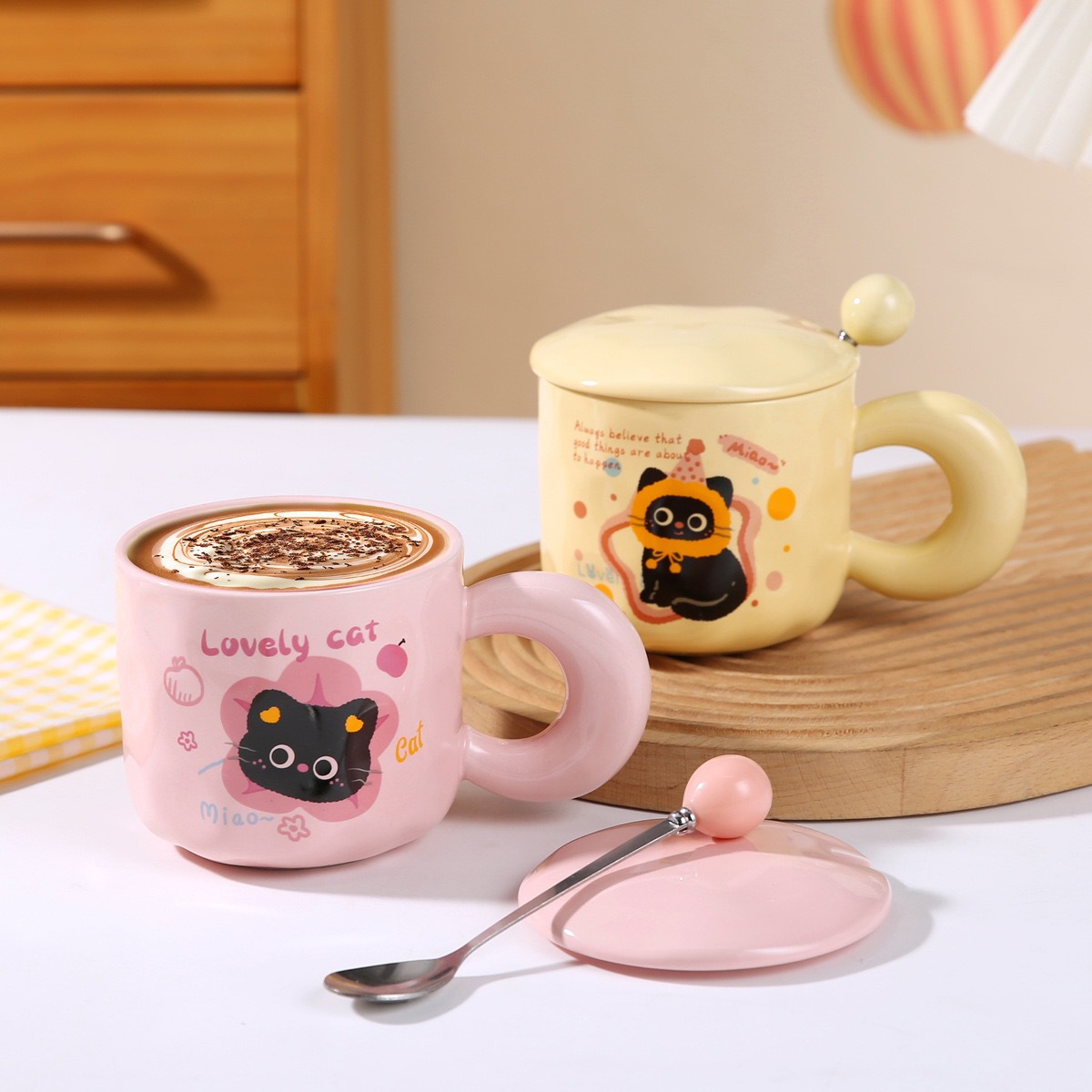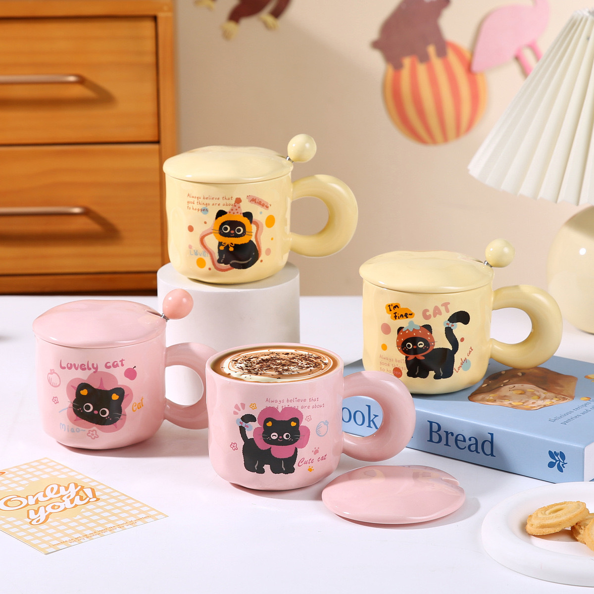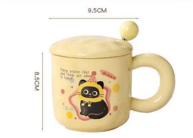 Color: Kitten yellow single cup, Cat Head yellow single cup, strawberry cat pink single cup, Christmas cat pink single cup, kitten pink with cover spoon, cat head pink with cover spoon, strawberry cat yellow with cover spoon, Christmas cat yellow with cover spoon