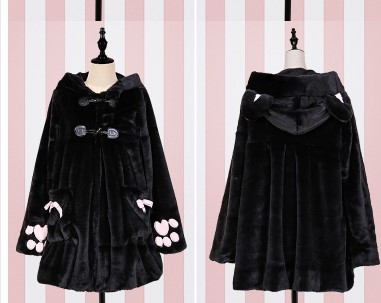 Women Winter Cartoon Fur Coats Japanese Kawaii Sweet Cat Paw Embroidery Faux Fur Soft Sister Long Warm Overcoat with Ears Hooded