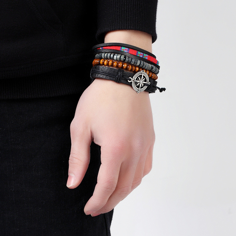 Material: leatherProcessing technology: weavingType: braceletStyle: UnisexStyling: compassPackaging: Individually packedColor: leather + wooden beads + alloy + wax rope