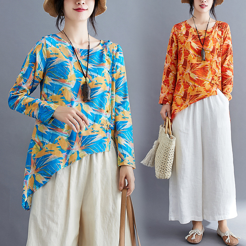 Style: Pants suitMain fabric composition: CottonThe content of the main fabric ingredient: 71%-80%Colour: Orange top + white wide-leg pantsBlue top + apricot wide-leg pantsGreen top + apricot wide-leg pants
