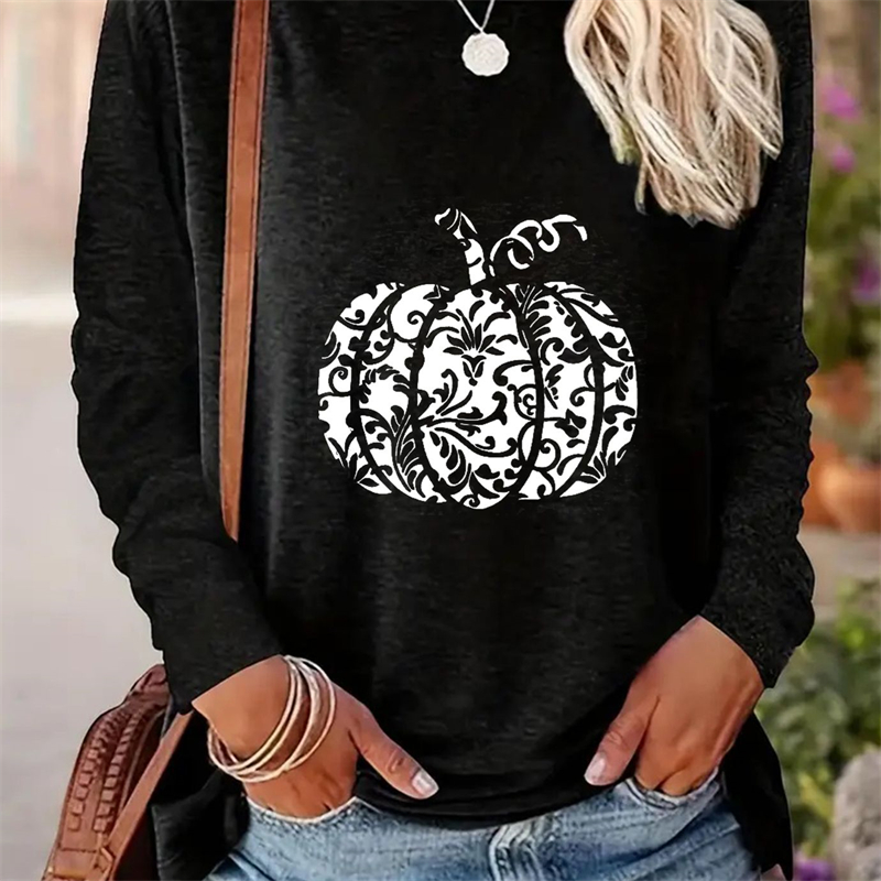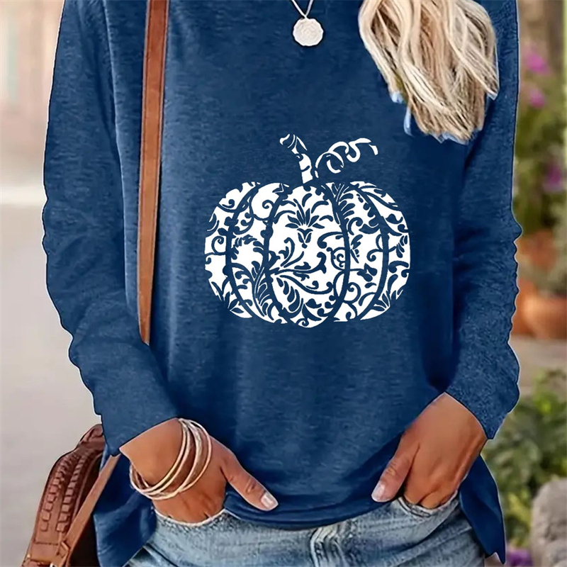 Spring And Autumn Women Casual Simple Pattern Printed Round Neck Long Sleeve T-shirt