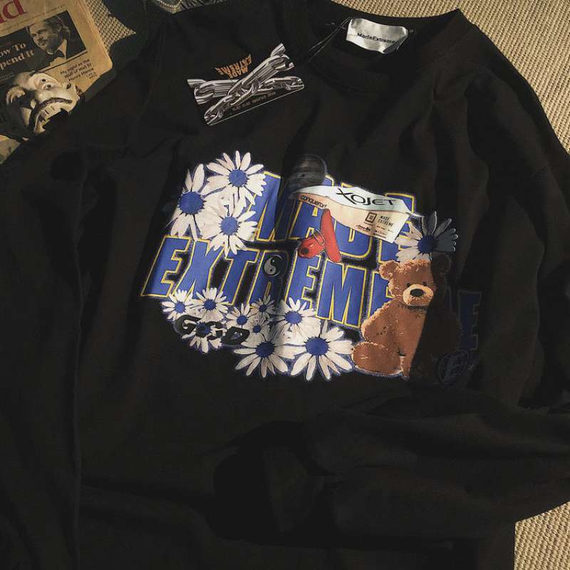 Black Regular Thin Round Neck Sweater, Daisy Bear White Regular Thin Round Neck