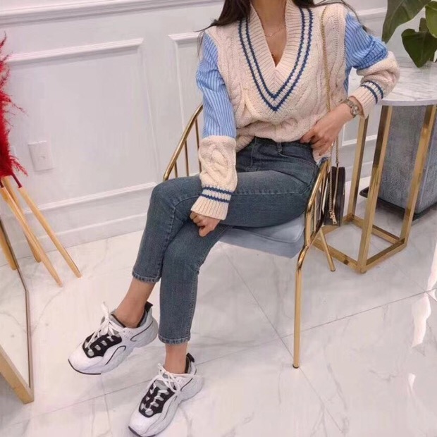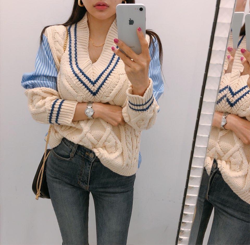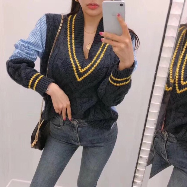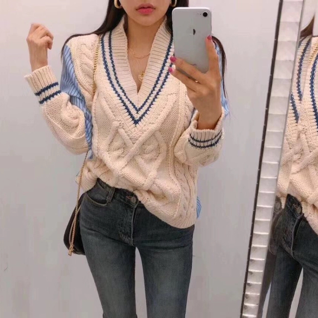 Contrast stitching deep V-neck knitted sweater