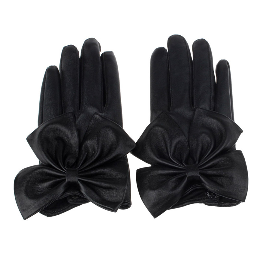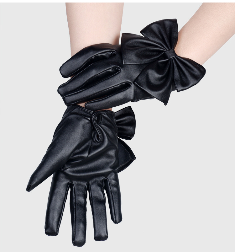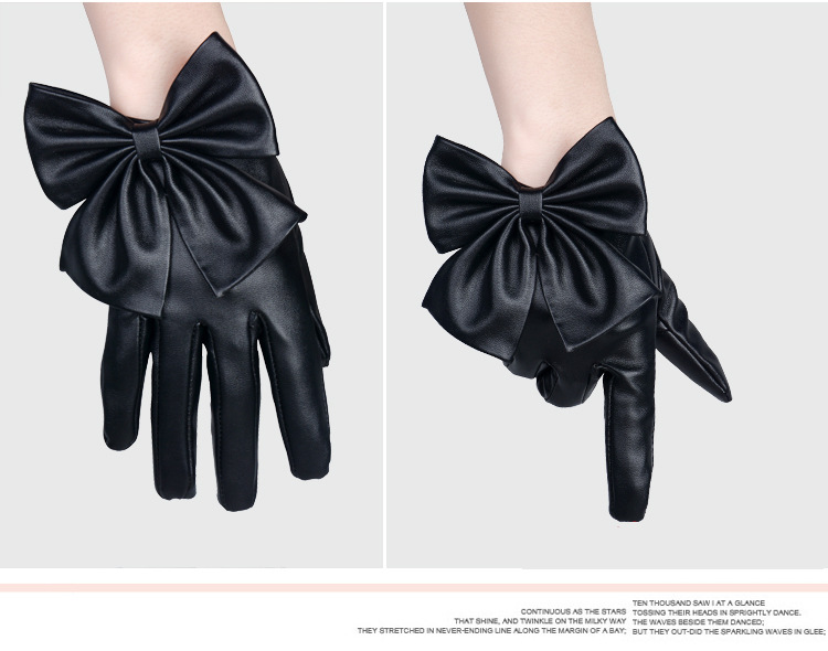 Material: puUse classification: clothing glovesApplicable gender: femaleProcessing method: paintFunction: Keep warmPattern: BowknotStyle: split finger glovesColour: Blacksize: one size