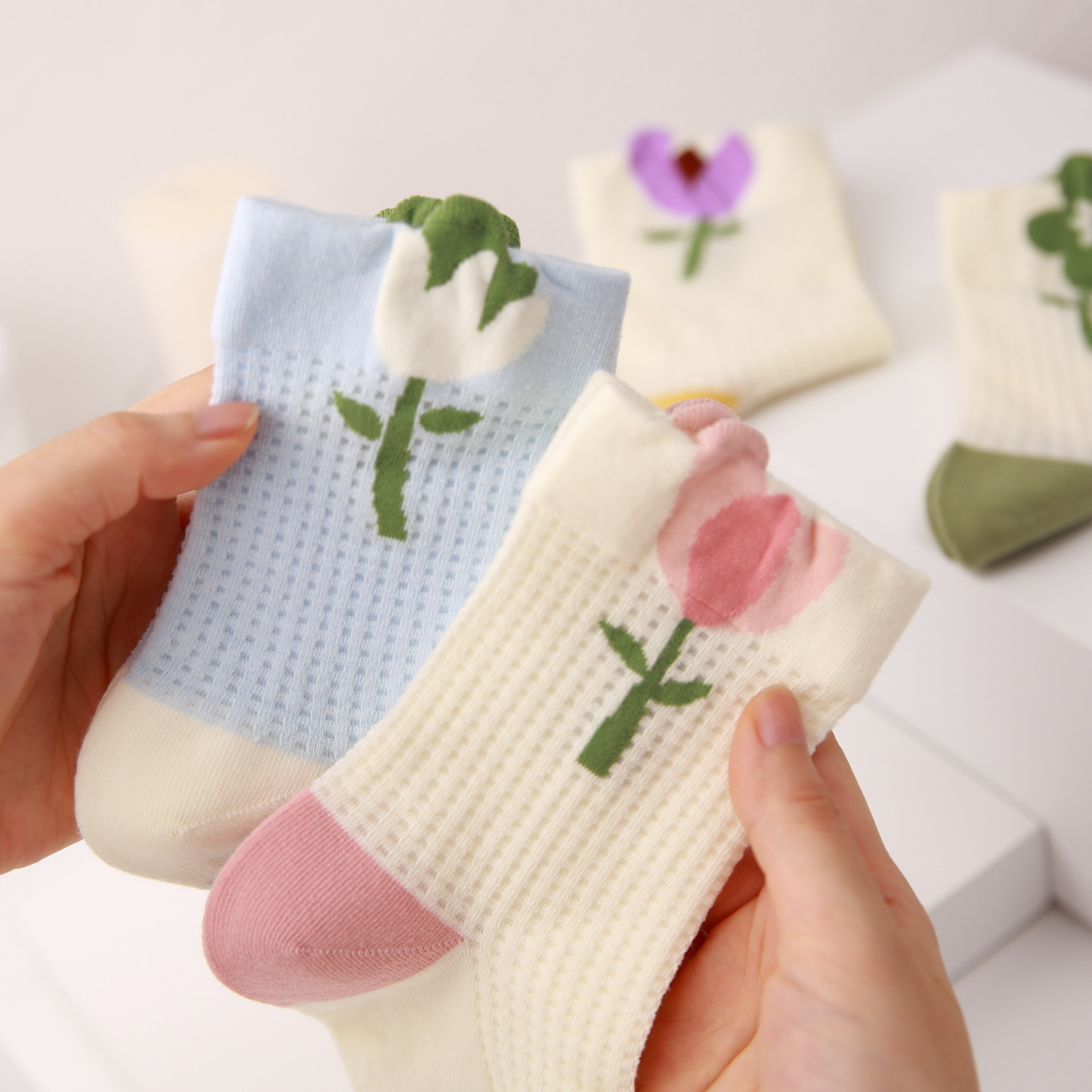 Color: pink flower on white background, purple flower on white background, green flower on white background, blue background