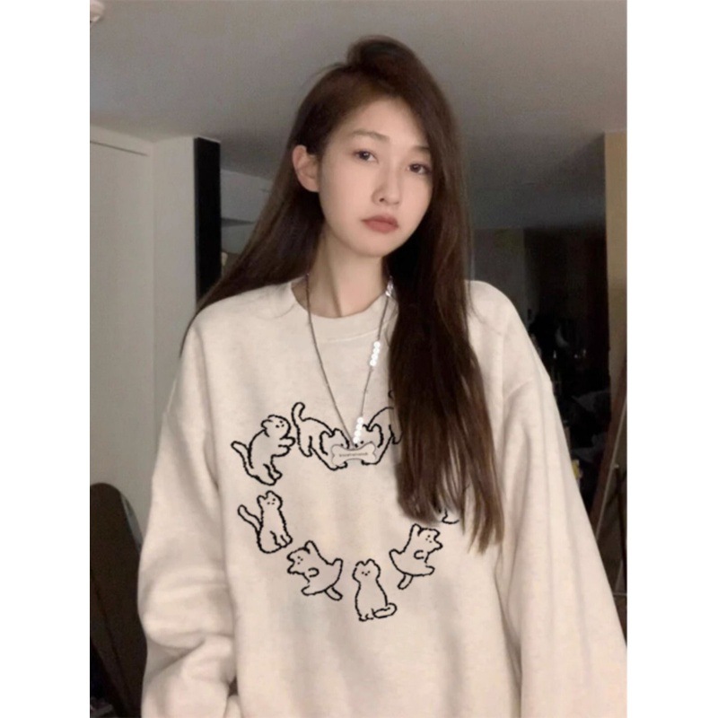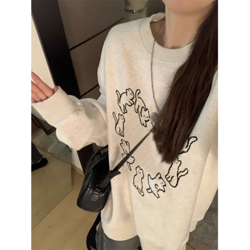 Color: light gray cotton thin crew neck sweater cat love, white cotton thin crew neck sweater cat love, light gray cotton crew neck sweater fleece cat love, white cotton crew neck sweater fleece-lined cat love