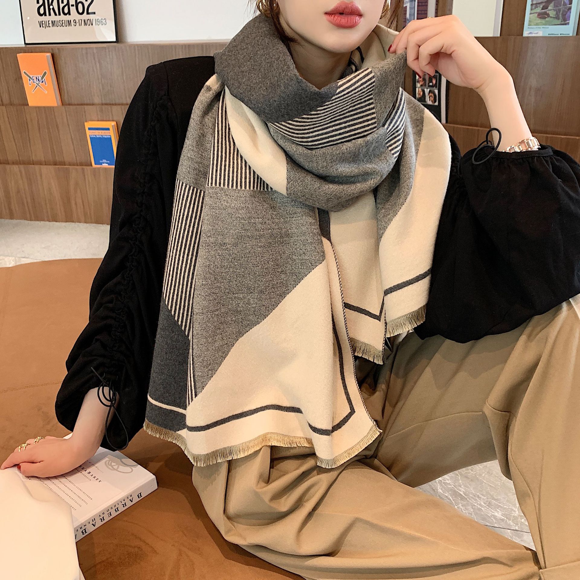 Material: imitation cashmereWeaving method: satinProcessing method: jacquardFunction: Keep warmPattern: gridColor: black, beige, Pink greyLength (CM): 180*65, 190*60cm