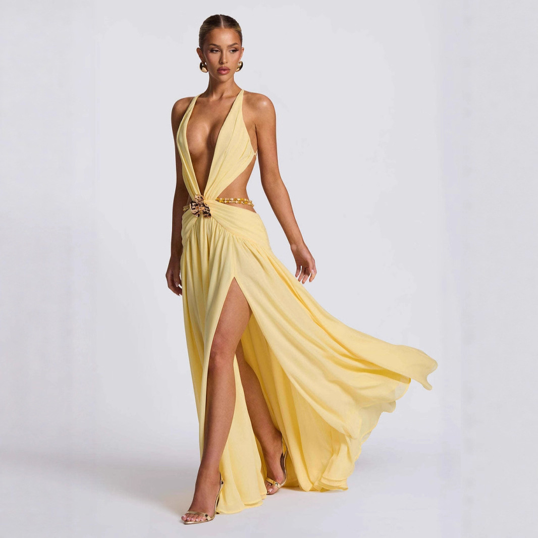 Product information: Color: yellow Sleeve type: sleeveless Main fabric composition: Polyester (polyester fiber) Size: XS,S,M,L Skirt Category: Dress Popular elements: splicing Specification: without waist chain