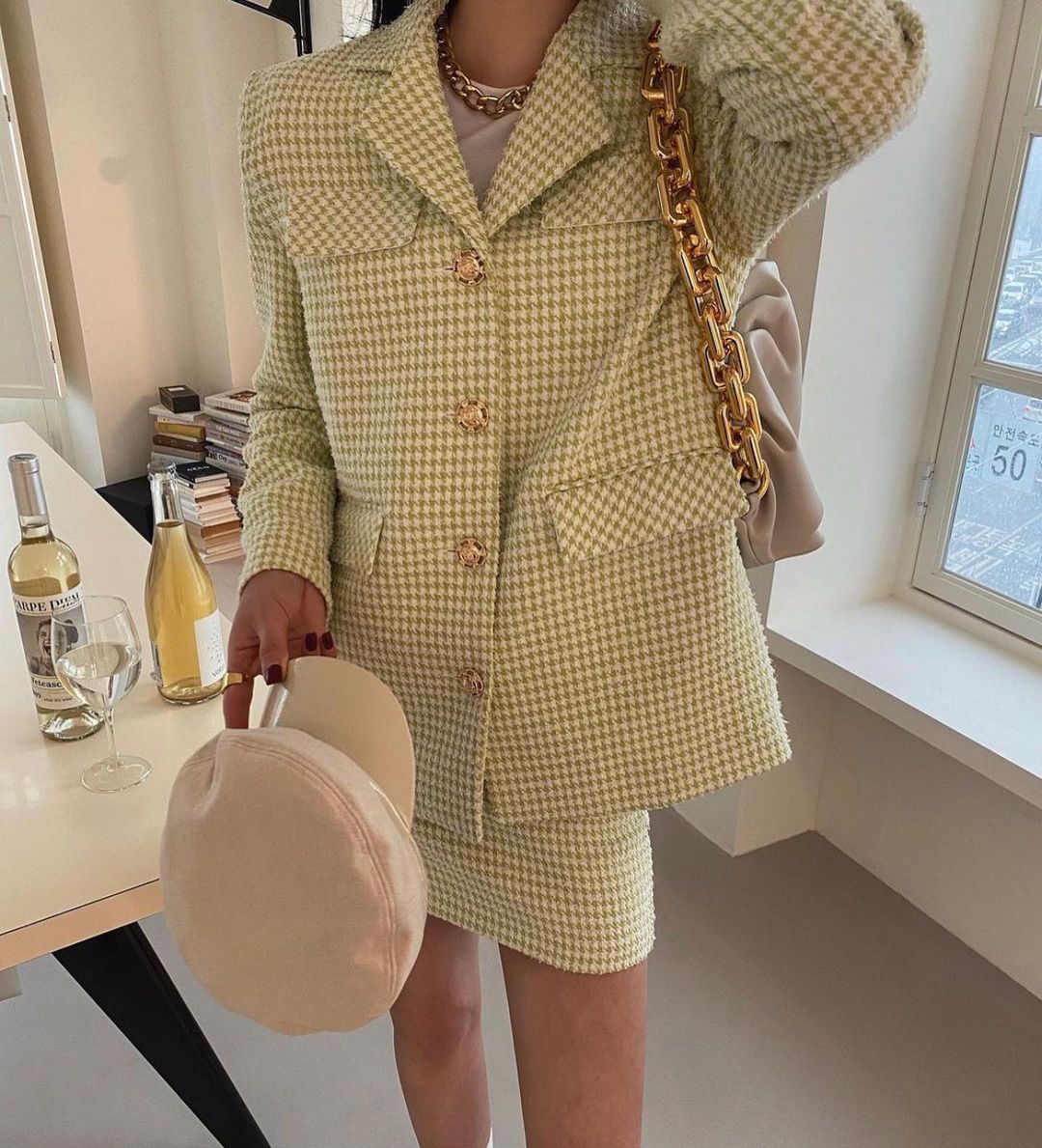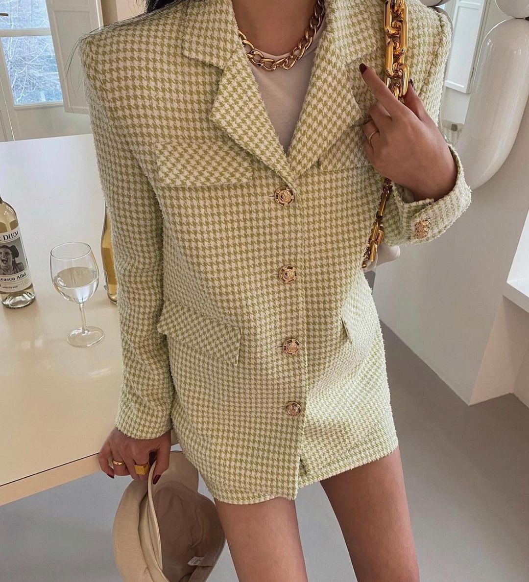 Color classification: Black and white grid suit, green grid suit