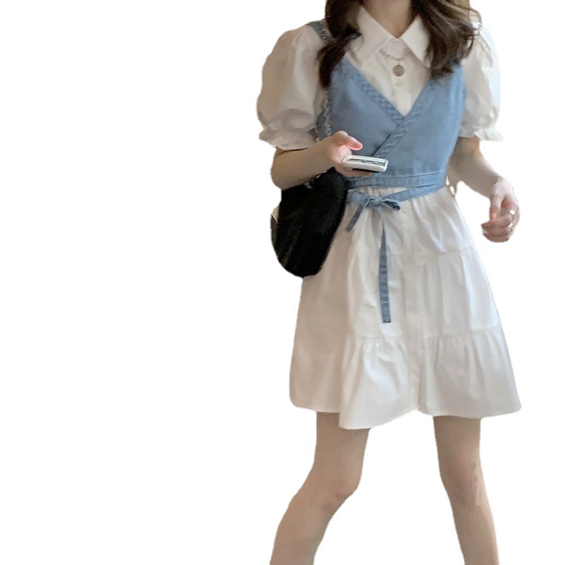 Color: white shirt skirt 520, blue shirt skirt 520, light blue denim suspender 8291, dark blue denim suspender 8291