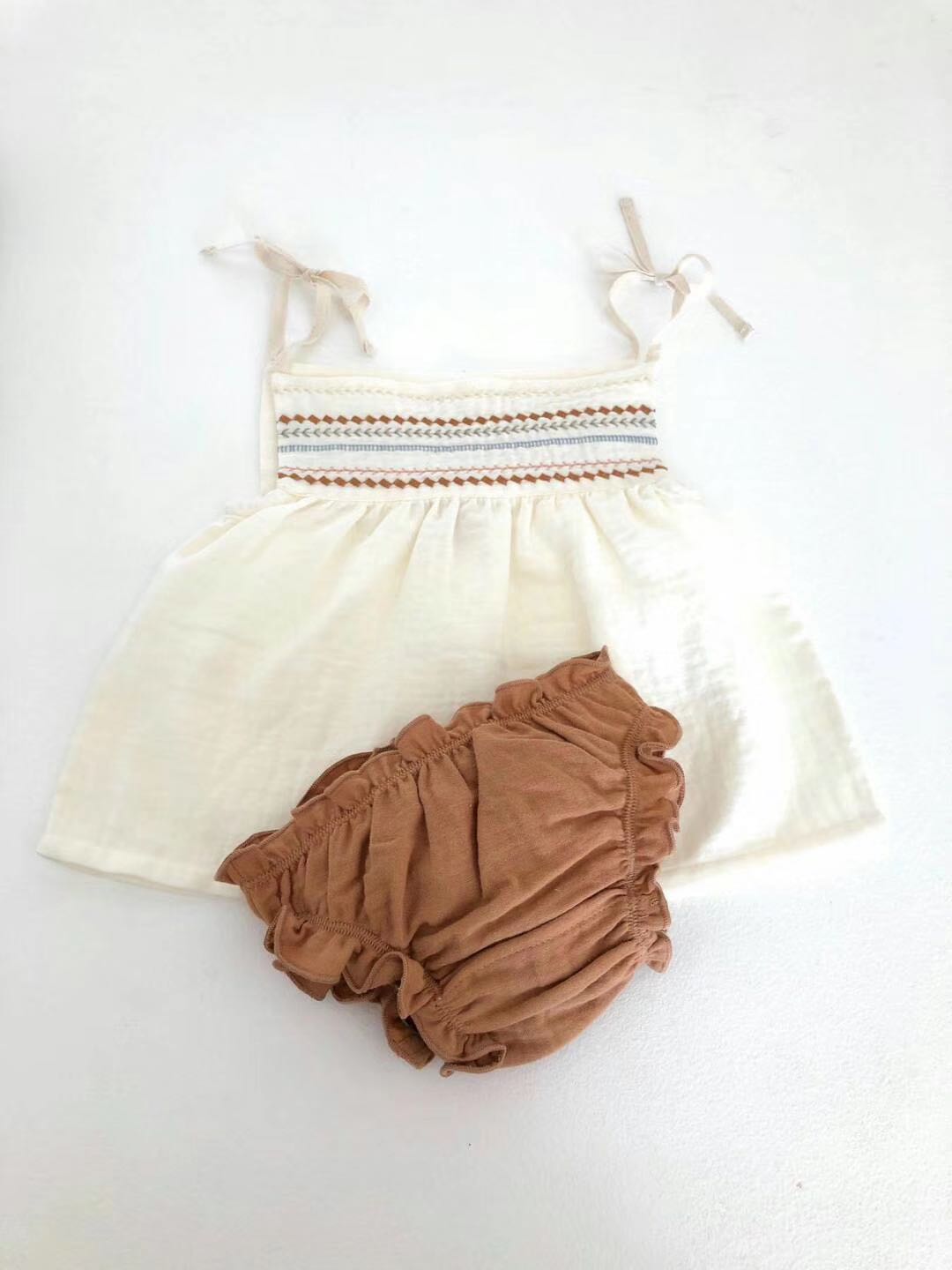Color classification: A: white embroidered suspenders, B: brown lace shorts, C: white embroidered jumpsuits