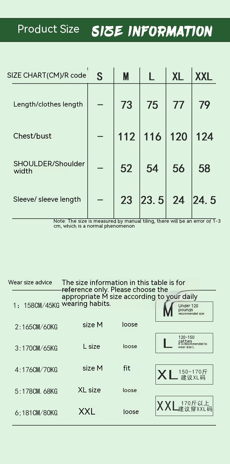 1. Asian sizes are 1 to 2 sizes smaller than European and American people. Choose the larger size if your size between two sizes. Please allow 2-3cm differences due to manual measurement. 2. Please check the size chart carefully before you buy the item, if you don't know how to choose size, please contact our customer service. 3.As you know, the different computers display colors differently, the color of the actual item may vary slightly from the following images.