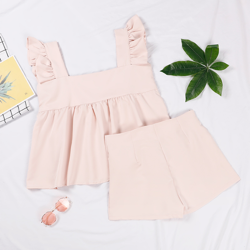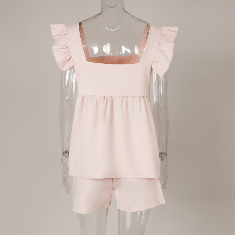 Butterfly Sleeve Square Neck Women's Suit Pink Solid Color Ruffle