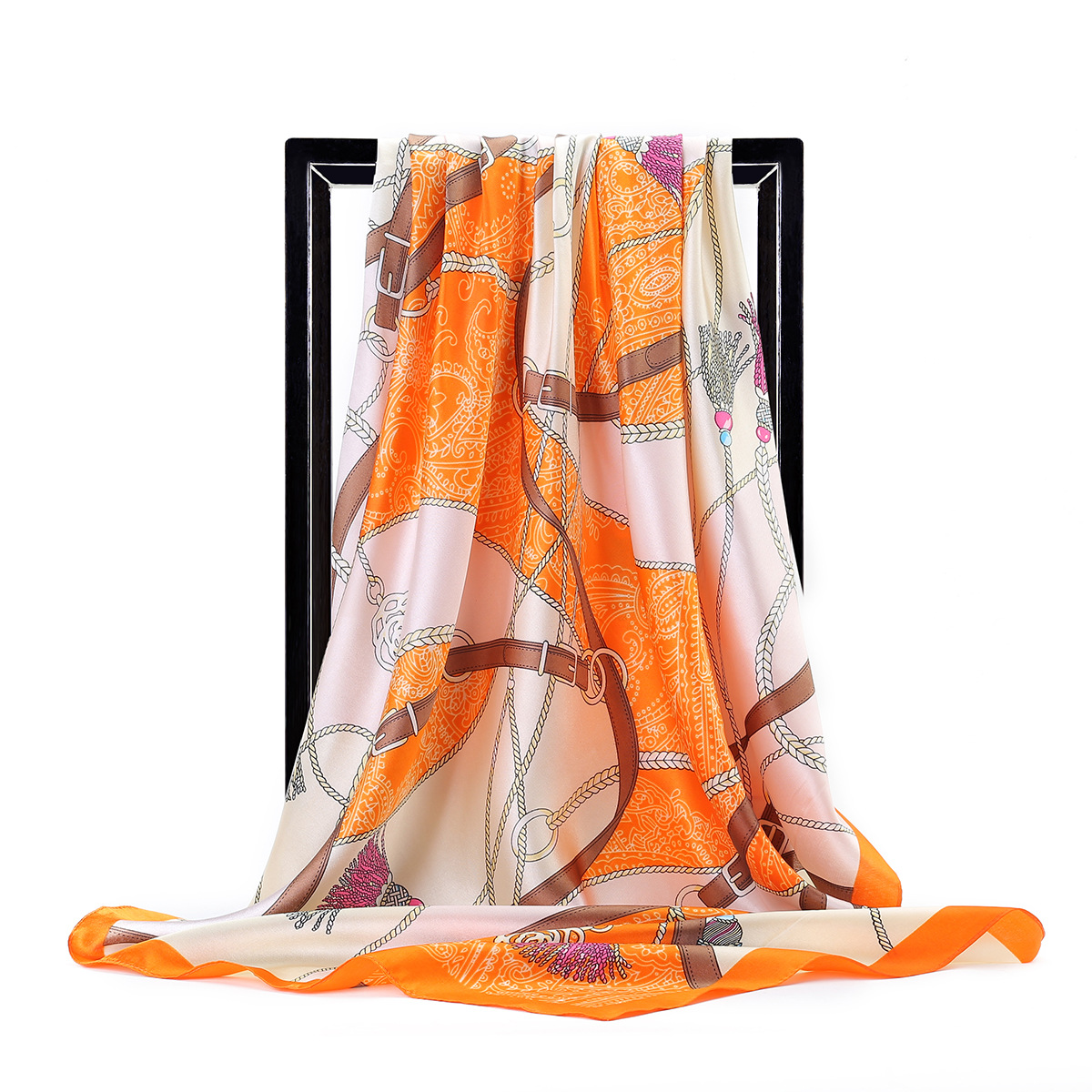 Material: artificial silkApplicable gender: femaleWeaving method: plain weaveProcessing method: printingPattern: carriage chainSize: 90*90CM
