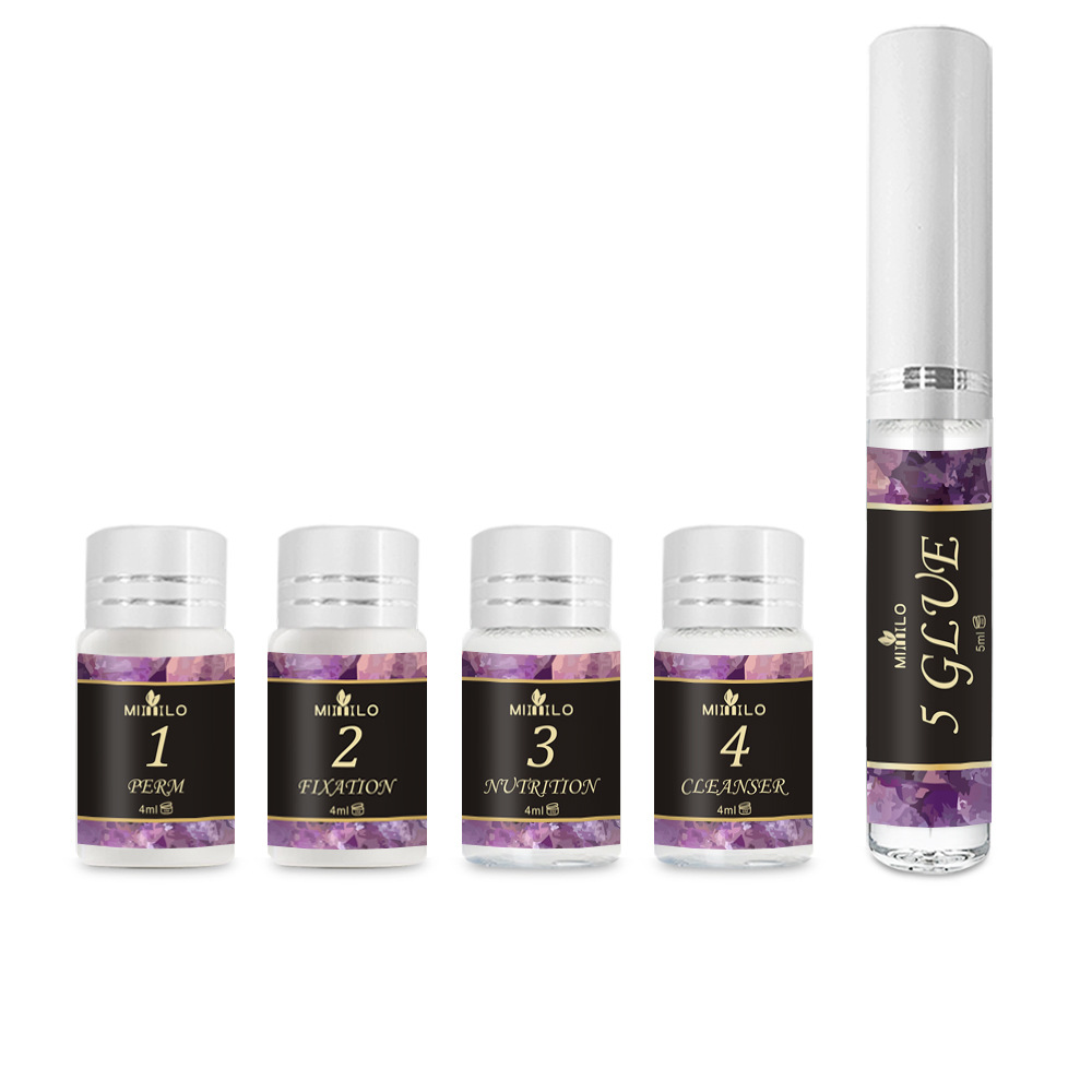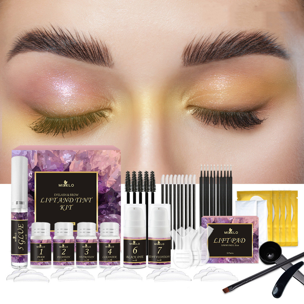 1x #1 perm lotion, 1x #2 fixing, 1x #3 nutrition, 1x #4 cleanser, 1x #5 false glue eyelashes, 1x #6 black dye, 1x #7 tint fixation, 10x cotton swabs, 10x cotton eyelash swabs, 5x brushes, 5 x pairs silicone pads, 3x y brush, 5x lifting pads, 1x eyebrow pen, 2x spoon