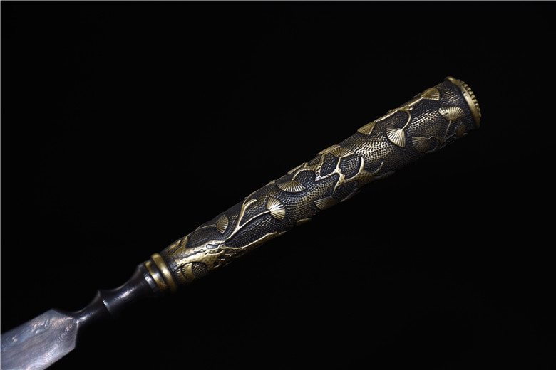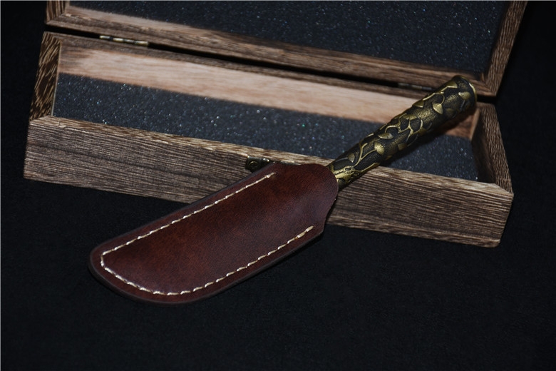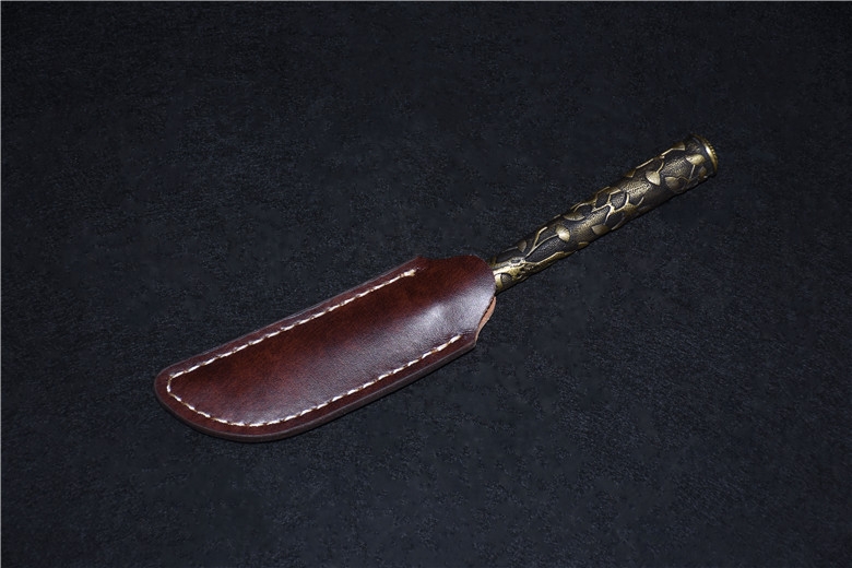 Full length: 210mmBlade length: 77mmBlade width: 23mmMaterial: one-piece pattern steel, copperPacking list: leather case + knife