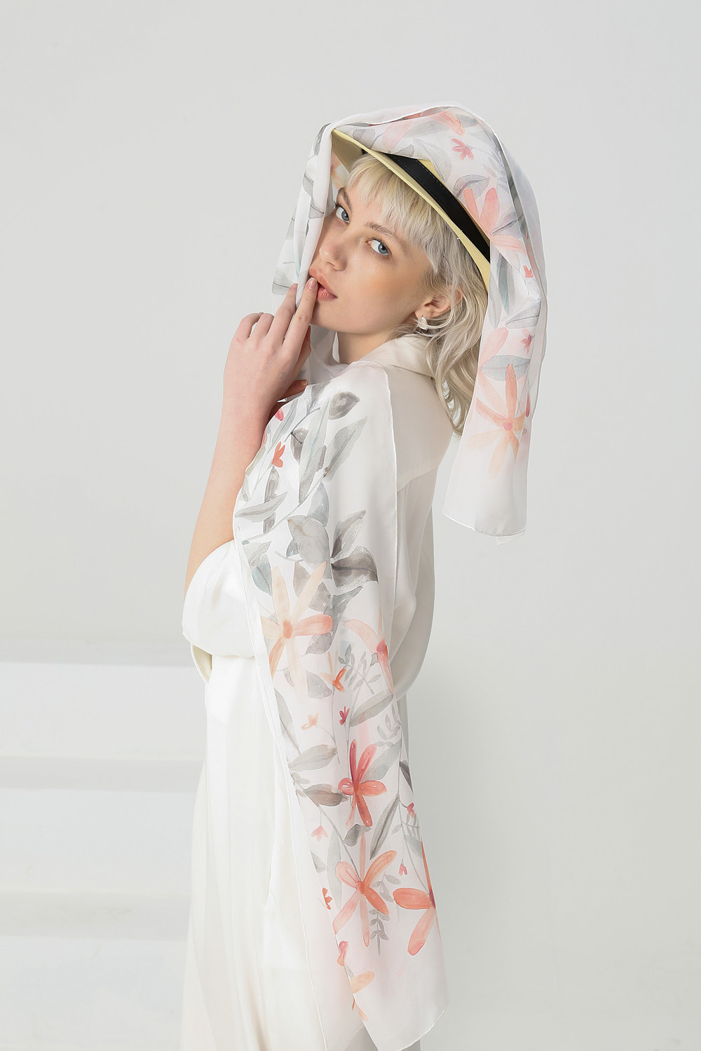 Material: Mulberry Silk (Silk Chiffon)Hemming: hand-made hemmingProcess: digital printingSize: 48*170cm (error 1-2cm)Silk chiffon long towel is soft and comfortable, suitable for summer air-conditioned rooms or travel sunscreen