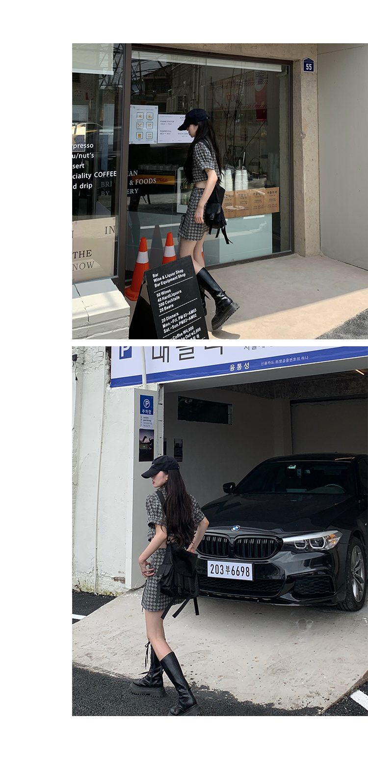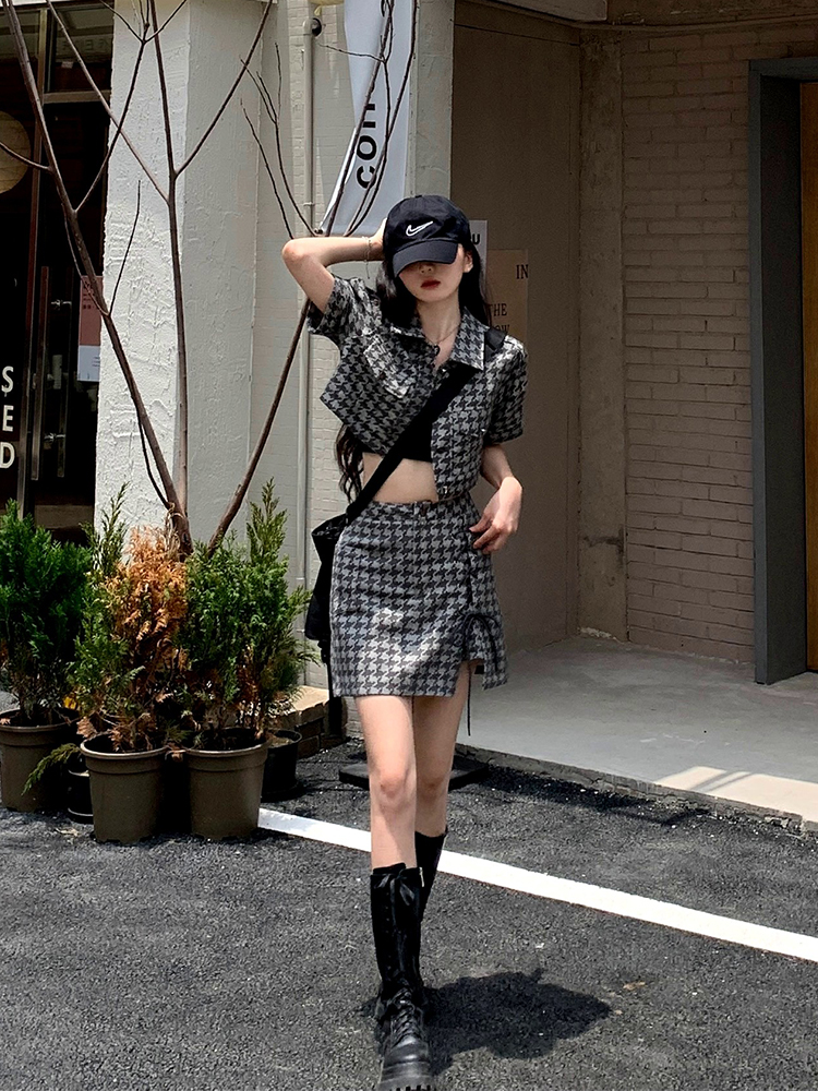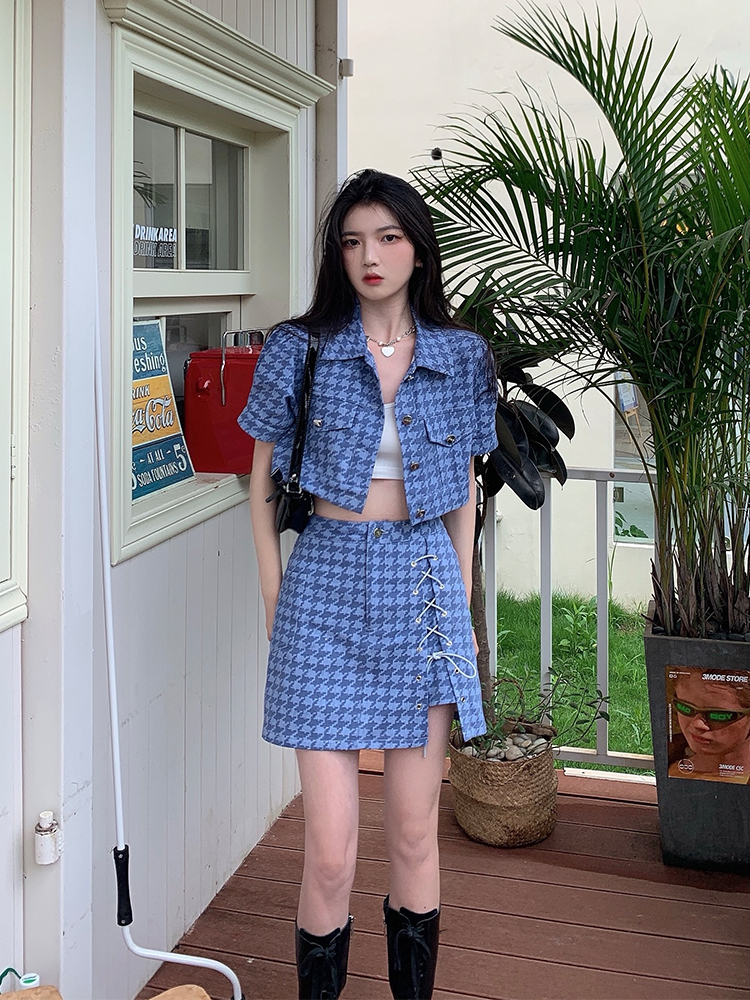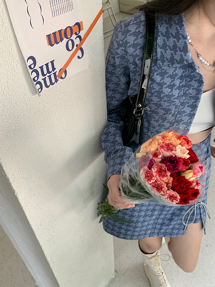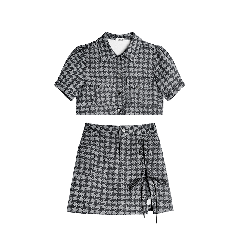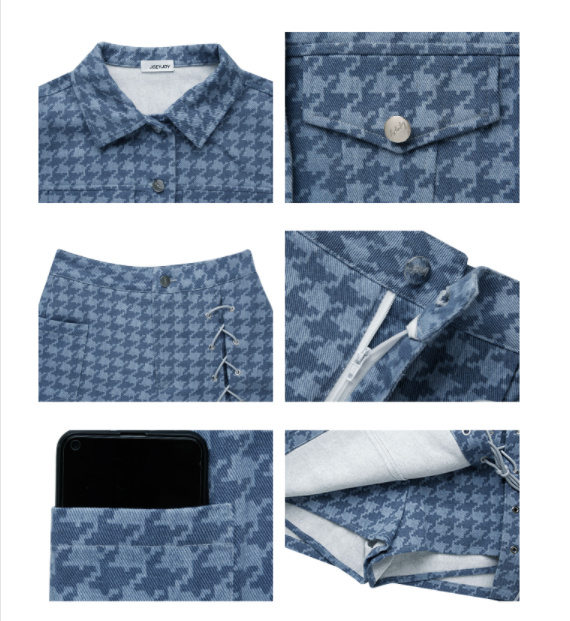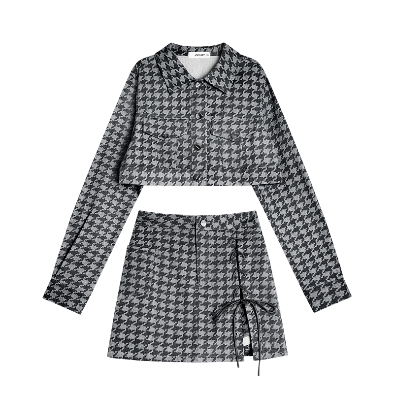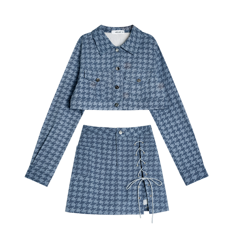 Color: blue houndstooth (short coat and half skirt), black and gray houndstooth (short coat and half skirt), blue houndstooth (long coat and half skirt), black and gray houndstooth (long coat and half skirt)